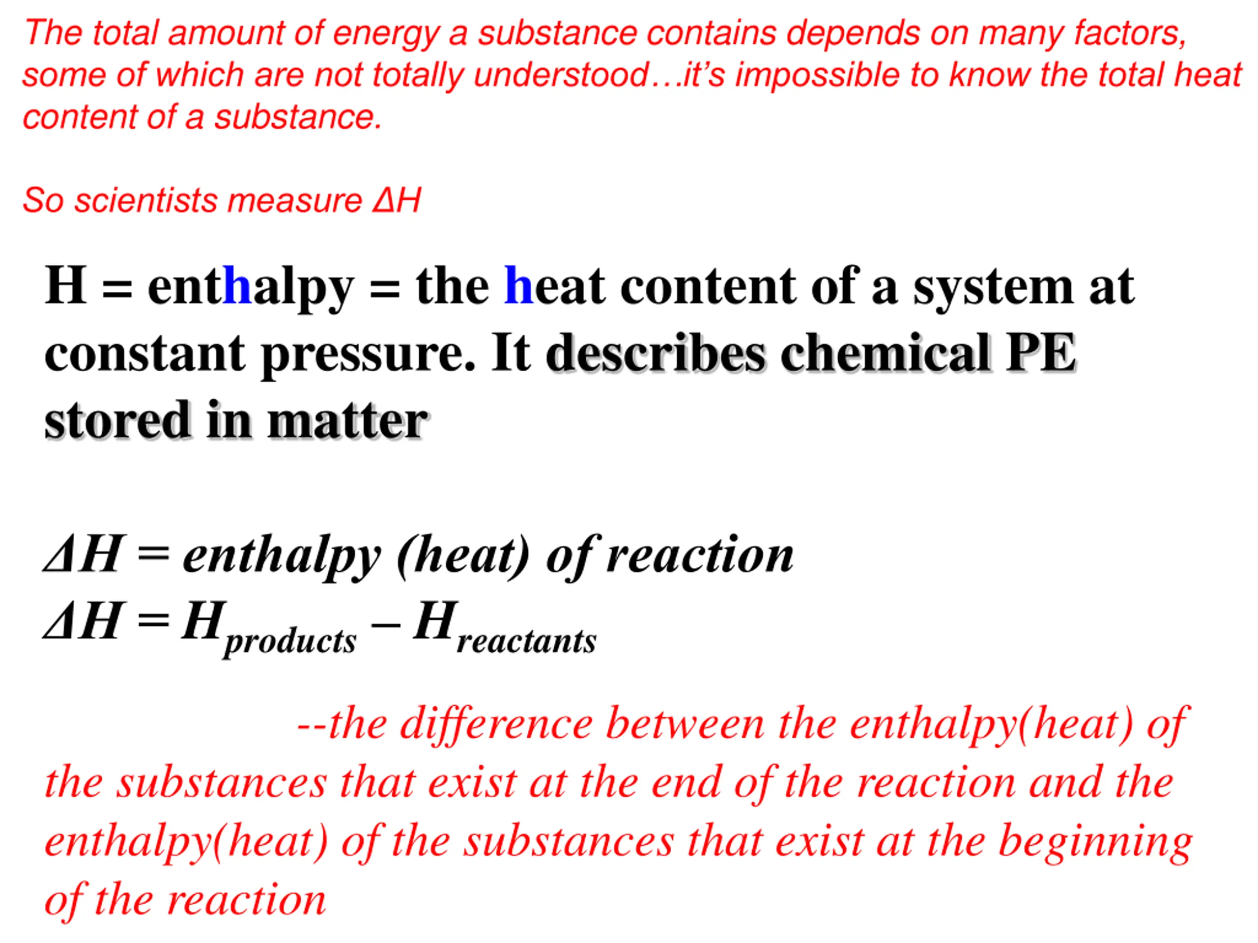 The total amount of energy a substance contains depends on many factors, some of which are not totally understood it s impossible to know the total heat content of a substance. So scientists measure H H = enthalpy = the heat content of a system at constant pressure. It describes chemical PE stored in matter H = enthalpy (heat) of reaction H = Hproducts Hreactants the substances that exist at the end of the reaction and the enthalpy(heat) of the substances that exist at the beginning of the reaction --the difference between the enthalpy(heat) of