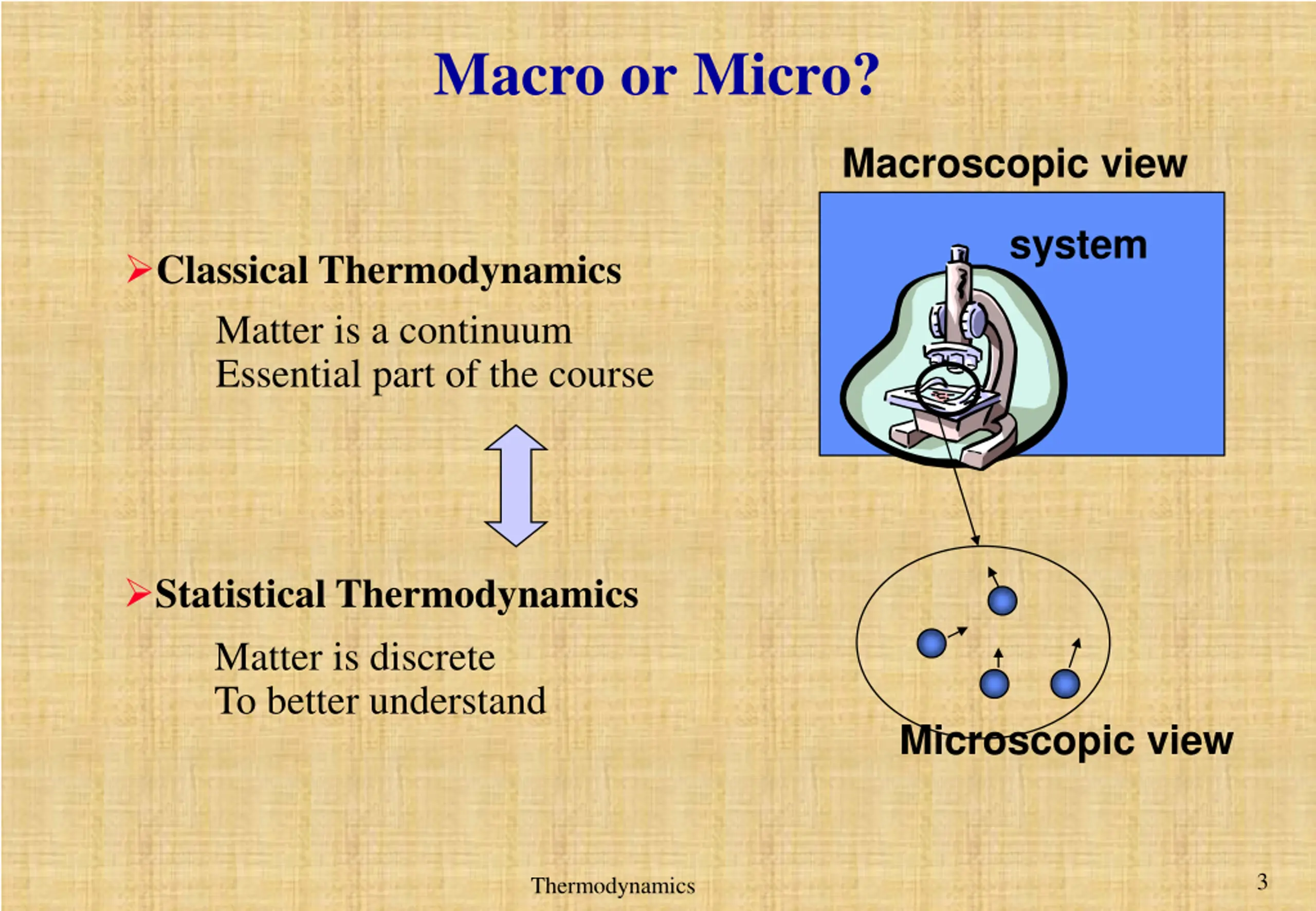 Macro or Micro? Macroscopic view system Classical Thermodynamics Matter is a continuum Essential part of the course Statistical Thermodynamics Matter is discrete To better understand Microscopic view 3 Thermodynamics