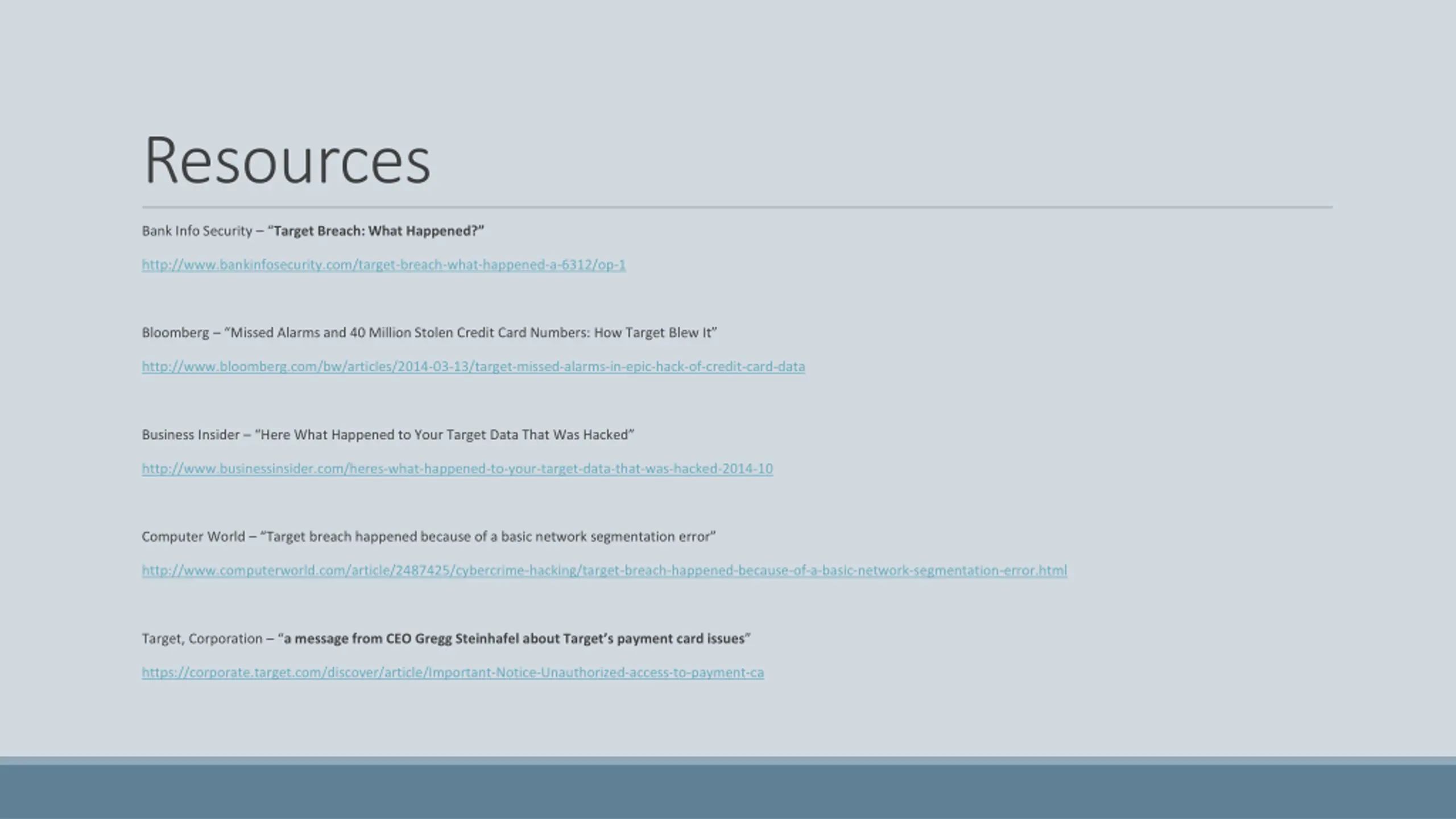 Resources Bank Info Security Target Breach: What Happened? http://www.bankinfosecurity.com/target-breach-what-happened-a-6312/op-1 Bloomberg Missed Alarms and 40 Million Stolen Credit Card Numbers: How Target Blew It http://www.bloomberg.com/bw/articles/2014-03-13/target-missed-alarms-in-epic-hack-of-credit-card-data Business Insider Here What Happened to Your Target Data That Was Hacked http://www.businessinsider.com/heres-what-happened-to-your-target-data-that-was-hacked-2014-10 Computer World Target breach happened because of a basic network segmentation error http://www.computerworld.com/article/2487425/cybercrime-hacking/target-breach-happened-because-of-a-basic-network-segmentation-error.html Target, Corporation a message from CEO Gregg Steinhafel about Target s payment card issues https://corporate.target.com/discover/article/Important-Notice-Unauthorized-access-to-payment-ca