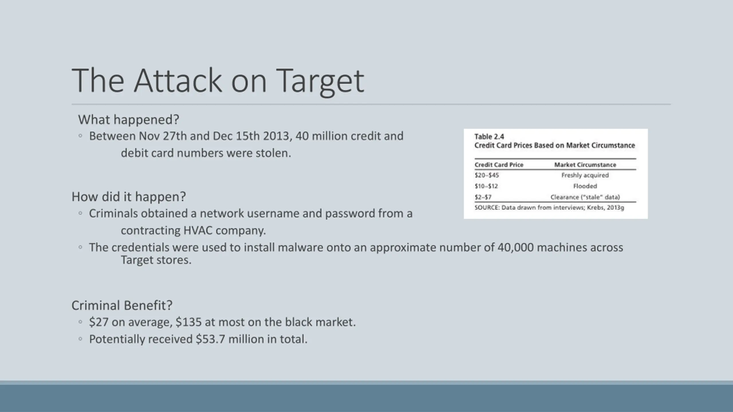 The Attack on Target What happened? Between Nov 27th and Dec 15th 2013, 40 million credit and debit card numbers were stolen. How did it happen? Criminals obtained a network username and password from a contracting HVAC company. The credentials were used to install malware onto an approximate number of 40,000 machines across Target stores. Criminal Benefit? $27 on average, $135 at most on the black market. Potentially received $53.7 million in total.