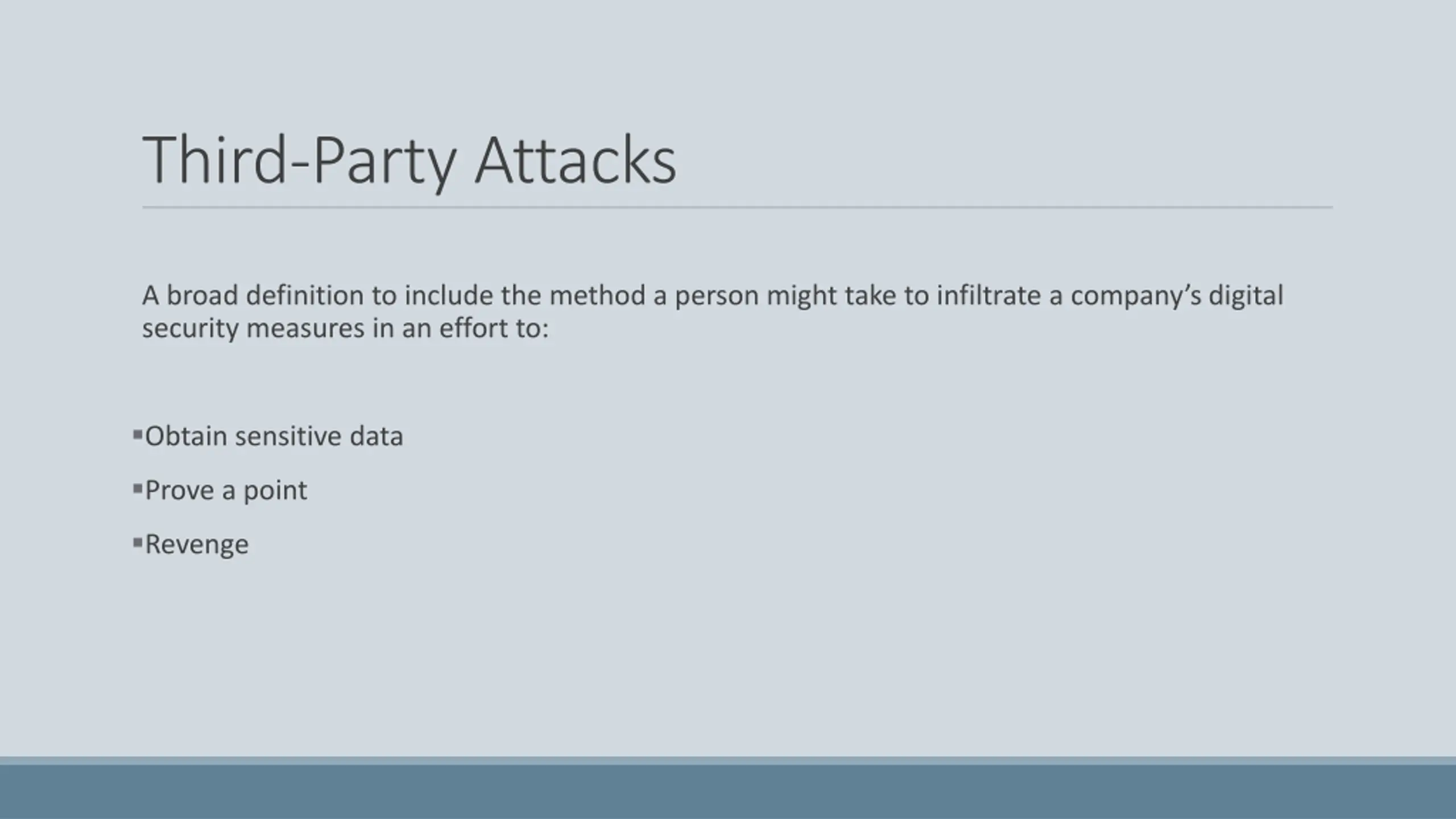 Third-Party Attacks A broad definition to include the method a person might take to infiltrate a company s digital security measures in an effort to: Obtain sensitive data Prove a point Revenge