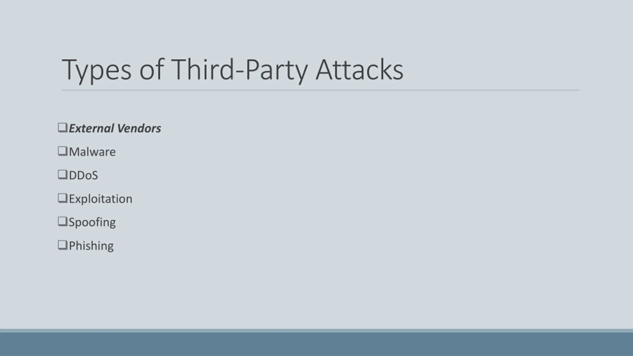 Types of Third-Party Attacks External Vendors Malware DDoS Exploitation Spoofing Phishing