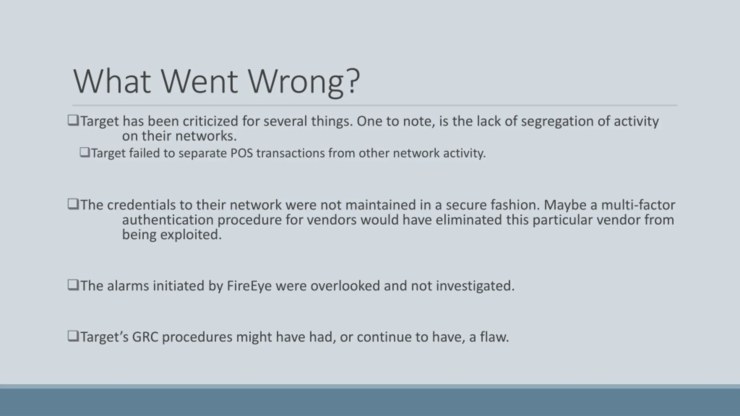 What Went Wrong? Target has been criticized for several things. One to note, is the lack of segregation of activity on their networks. Target failed to separate POS transactions from other network activity. The credentials to their network were not maintained in a secure fashion. Maybe a multi-factor authentication procedure for vendors would have eliminated this particular vendor from being exploited. The alarms initiated by FireEye were overlooked and not investigated. Target s GRC procedures might have had, or continue to have, a flaw.