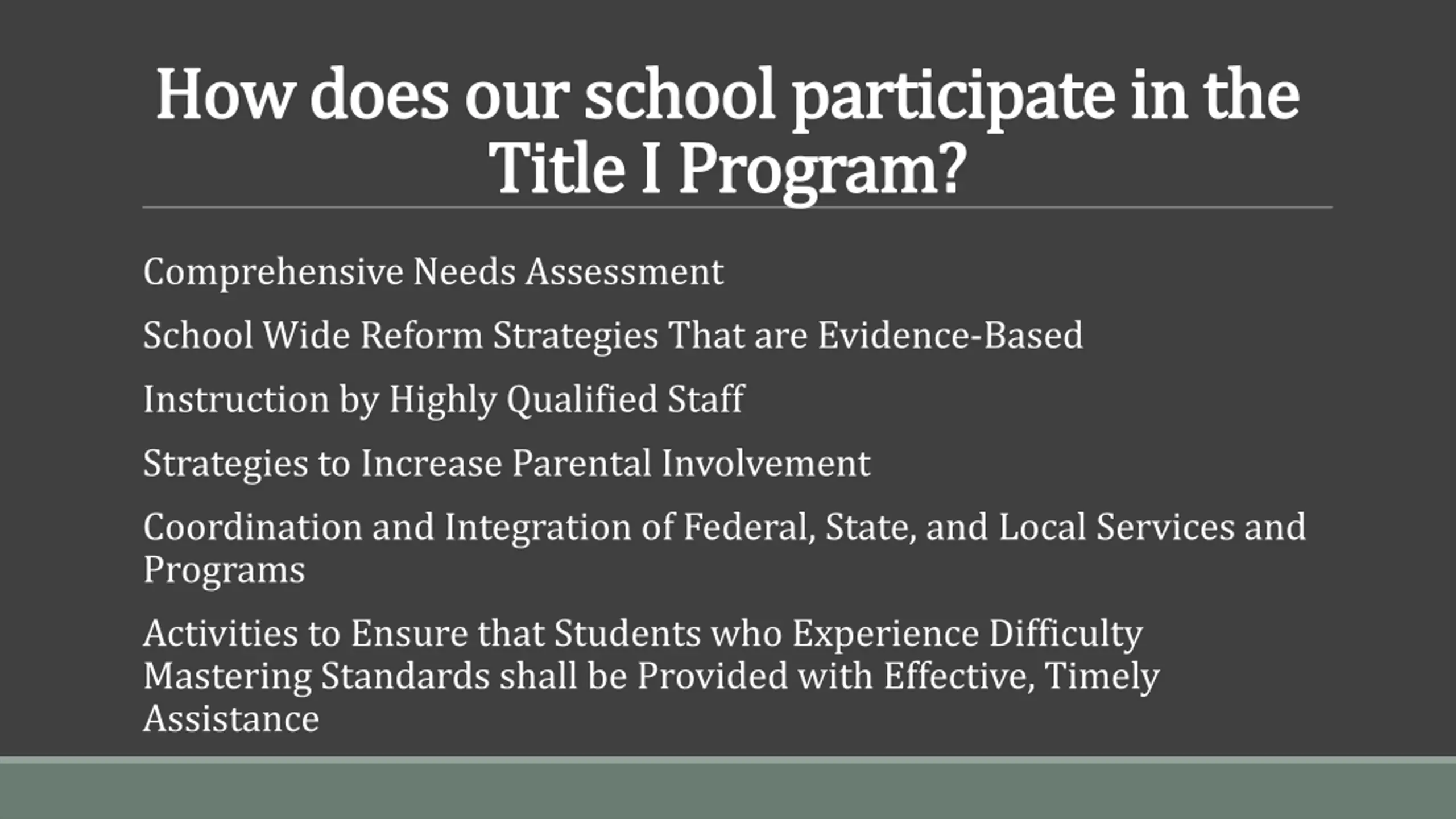 How does our school participate in the How does our school participate in the Title I Program Title I Program? ? Comprehensive Needs Assessment School Wide Reform Strategies That are Evidence-Based Instruction by Highly Qualified Staff Strategies to Increase Parental Involvement Coordination and Integration of Federal, State, and Local Services and Programs Activities to Ensure that Students who Experience Difficulty Mastering Standards shall be Provided with Effective, Timely Assistance