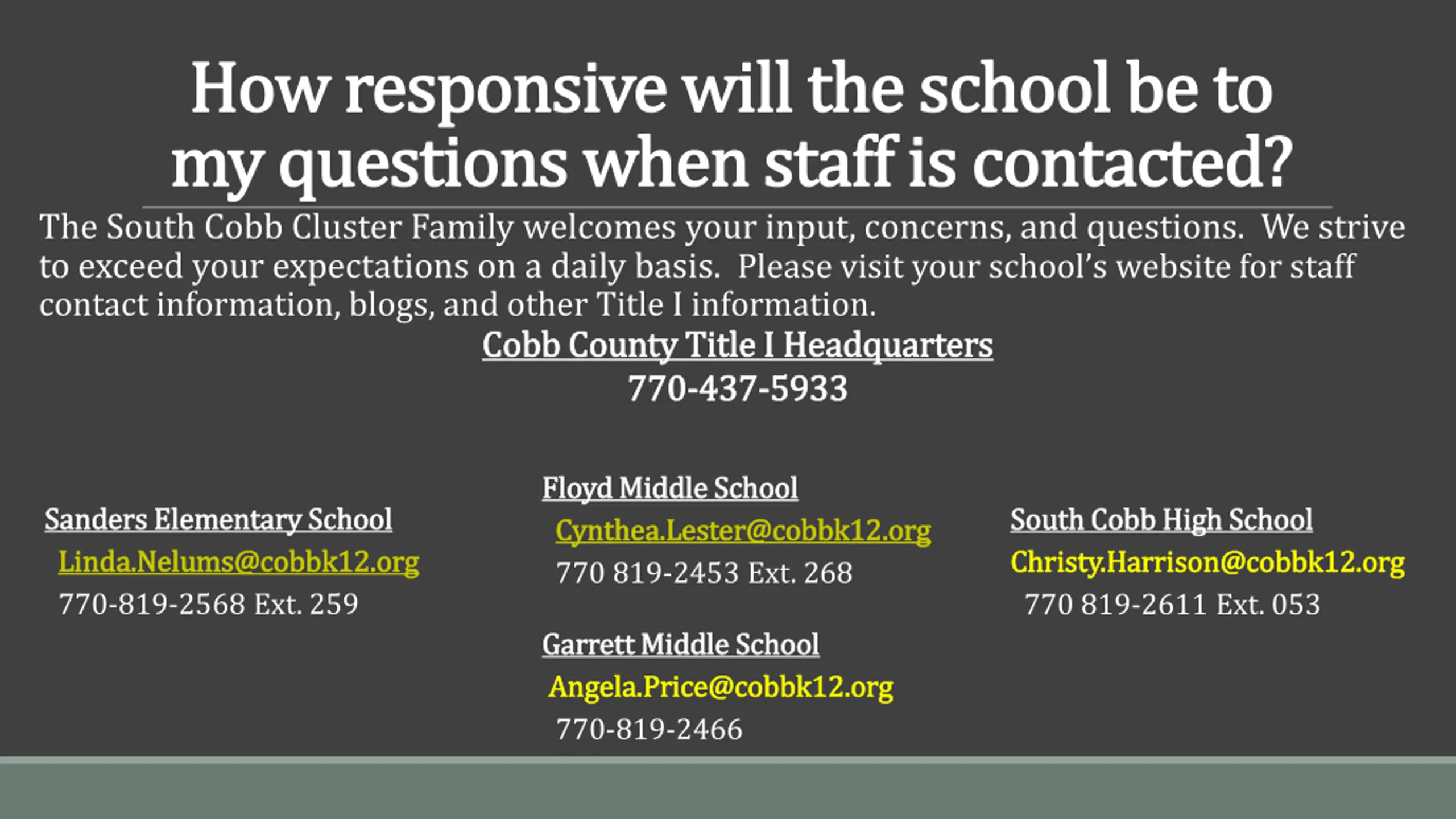 How responsive will the school be to How responsive will the school be to my questions when staff is contacted? my questions when staff is contacted? The South Cobb Cluster Family welcomes your input, concerns, and questions. We strive to exceed your expectations on a daily basis. Please visit your school s website for staff contact information, blogs, and other Title I information. Cobb County Title I Headquarters Cobb County Title I Headquarters 770 770- -437 437- -5933 5933 Floyd Middle School Floyd Middle School Cynthea.Lester@cobbk12.org Cynthea.Lester@cobbk12.org 770 819-2453 Ext. 268 Sanders Sanders Elementary School Elementary School Linda.Nelums@cobbk12.org Linda.Nelums@cobbk12.org 770-819-2568 Ext. 259 South Cobb High School South Cobb High School Christy.Harrison@cobbk12.org Christy.Harrison@cobbk12.org 770 819-2611 Ext. 053 Garrett Middle School Garrett Middle School Angela.Price@cobbk12.org Angela.Price@cobbk12.org 770-819-2466