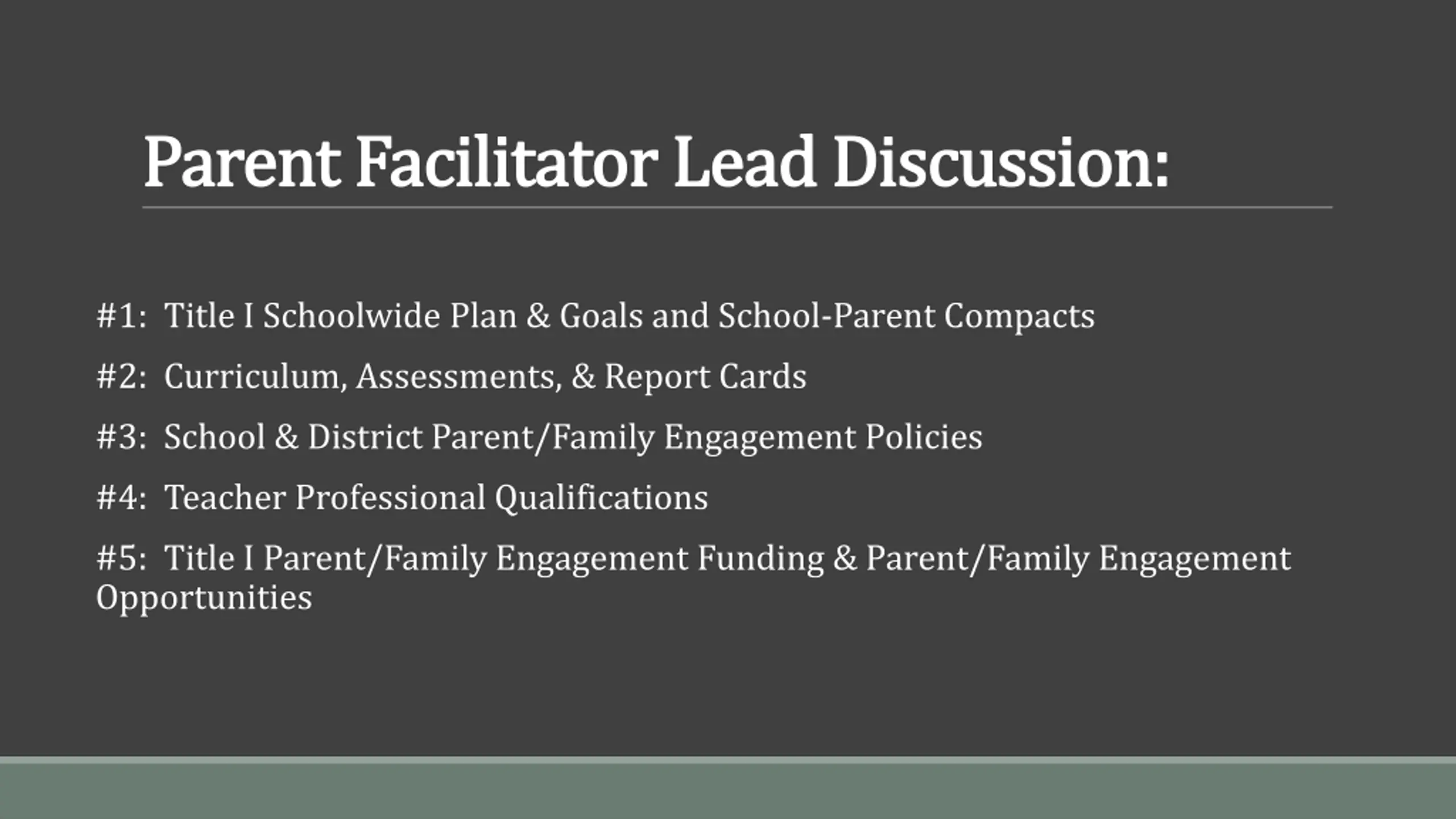 Parent Facilitator Lead Discussion Parent Facilitator Lead Discussion: : #1: Title I Schoolwide Plan & Goals and School-Parent Compacts #2: Curriculum, Assessments, & Report Cards #3: School & District Parent/Family Engagement Policies #4: Teacher Professional Qualifications #5: Title I Parent/Family Engagement Funding & Parent/Family Engagement Opportunities