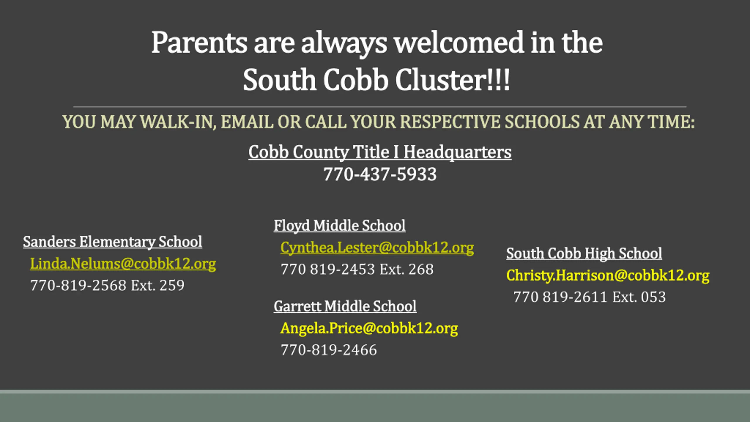 Parents are always welcomed in the Parents are always welcomed in the South Cobb Cluster!!! South Cobb Cluster!!! YOU MAY WALK YOU MAY WALK- -IN, EMAIL OR CALL YOUR RESPECTIVE SCHOOLS AT ANY TI IN, EMAIL OR CALL YOUR RESPECTIVE SCHOOLS AT ANY TIME: ME: Cobb Cobb County Title I County Title I Headquarters Headquarters 770 770- -437 437- -5933 5933 Floyd Middle School Floyd Middle School Cynthea.Lester@cobbk12.org Cynthea.Lester@cobbk12.org 770 819-2453 Ext. 268 Sanders Sanders Elementary School Elementary School Linda.Nelums@cobbk12.org Linda.Nelums@cobbk12.org 770-819-2568 Ext. 259 South Cobb High School South Cobb High School Christy.Harrison@cobbk12.org Christy.Harrison@cobbk12.org 770 819-2611 Ext. 053 Garrett Garrett Middle School Middle School Angela.Price@cobbk12.org Angela.Price@cobbk12.org 770-819-2466