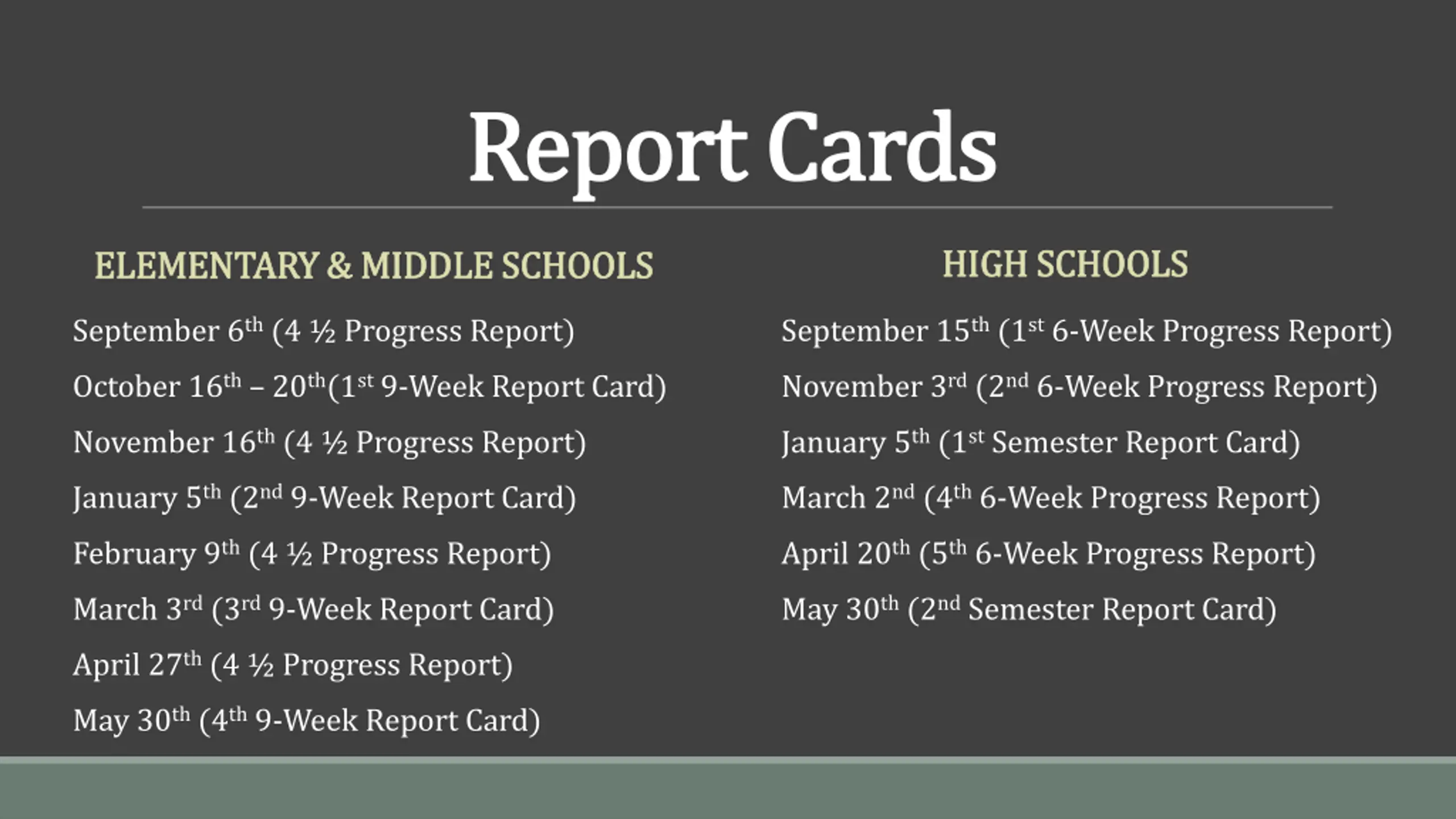 Report Cards Report Cards HIGH SCHOOLS HIGH SCHOOLS ELEMENTARY & MIDDLE ELEMENTARY & MIDDLE SCHOOLS SCHOOLS September 6th (4 Progress Report) September 15th (1st 6-Week Progress Report) October 16th 20th(1st 9-Week Report Card) November 3rd (2nd 6-Week Progress Report) November 16th (4 Progress Report) January 5th (1st Semester Report Card) January 5th (2nd 9-Week Report Card) March 2nd (4th 6-Week Progress Report) February 9th (4 Progress Report) April 20th (5th 6-Week Progress Report) March 3rd (3rd 9-Week Report Card) May 30th (2nd Semester Report Card) April 27th (4 Progress Report) May 30th (4th 9-Week Report Card)