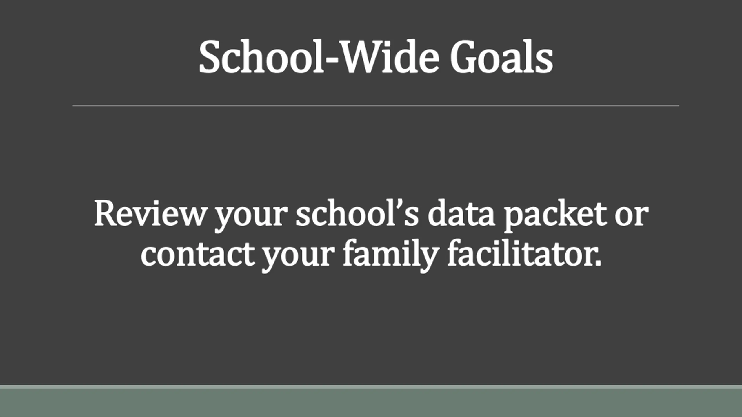 School School- -Wide Wide Goals Goals Review your school s data packet or Review your school s data packet or contact your family facilitator. contact your family facilitator.
