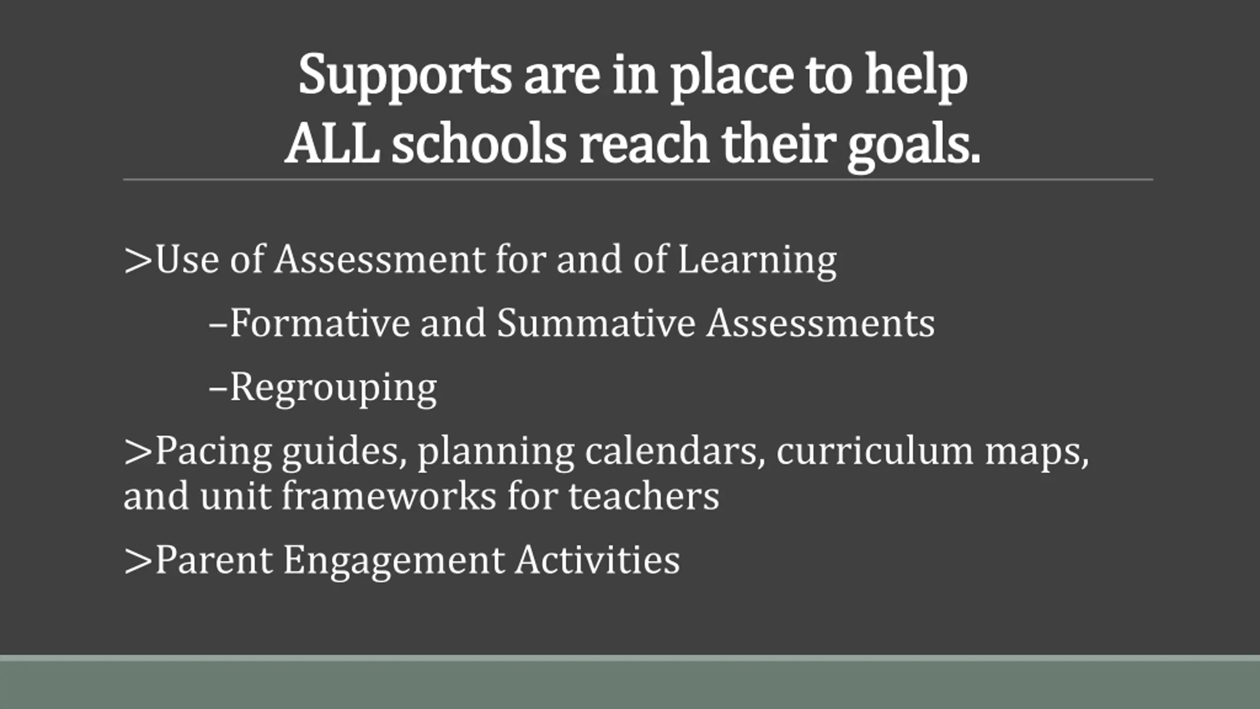 Supports are in place to help Supports are in place to help ALL schools reach their goals. ALL schools reach their goals. >Use of Assessment for and of Learning Formative and Summative Assessments Regrouping >Pacing guides, planning calendars, curriculum maps, and unit frameworks for teachers >Parent Engagement Activities