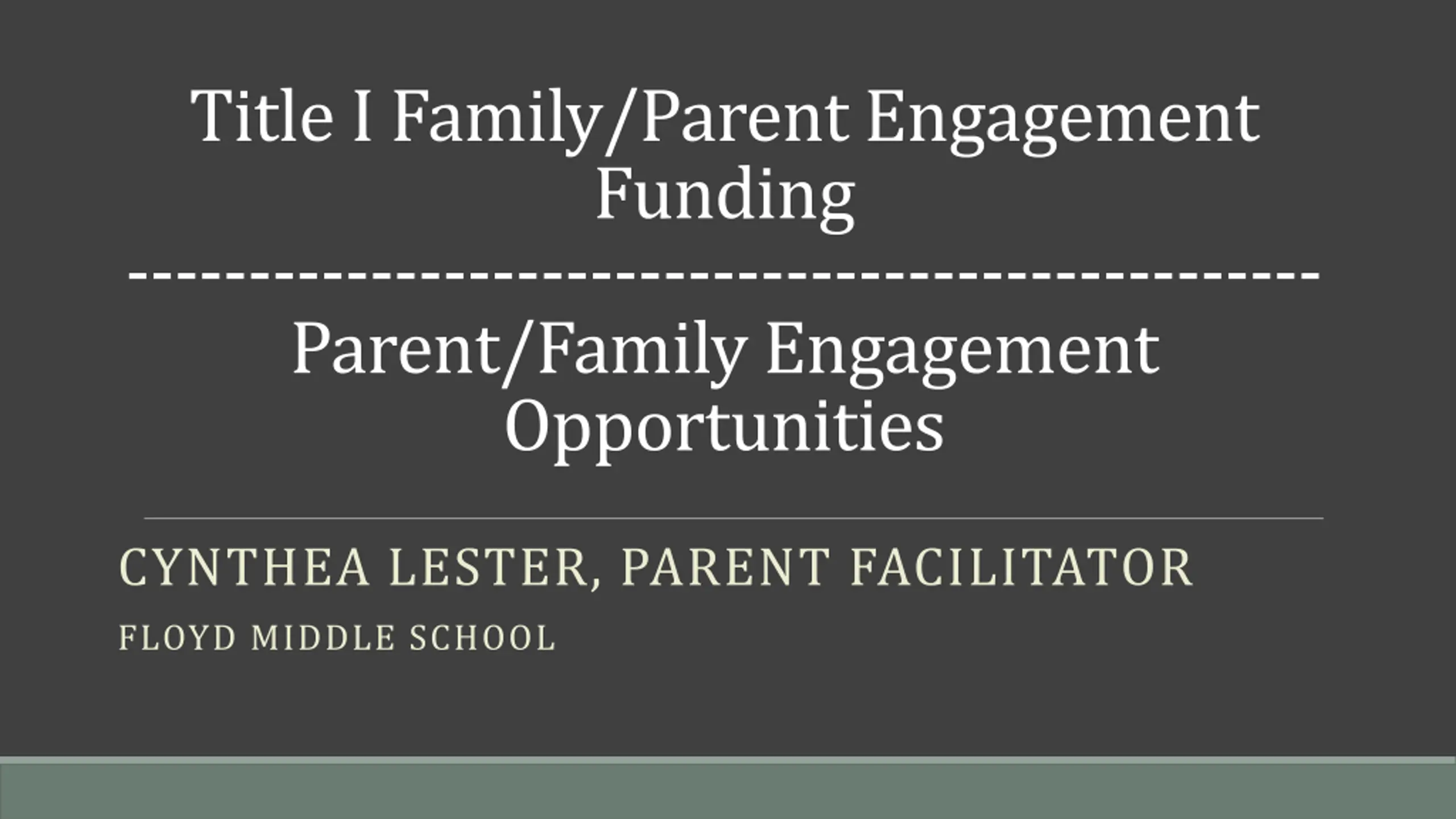 Title I Family/Parent Engagement Funding ------------------------------------------------- Parent/Family Engagement Opportunities CYNTHEA LESTER, PARENT FACILITATOR FLOYD MIDDLE SCHOOL