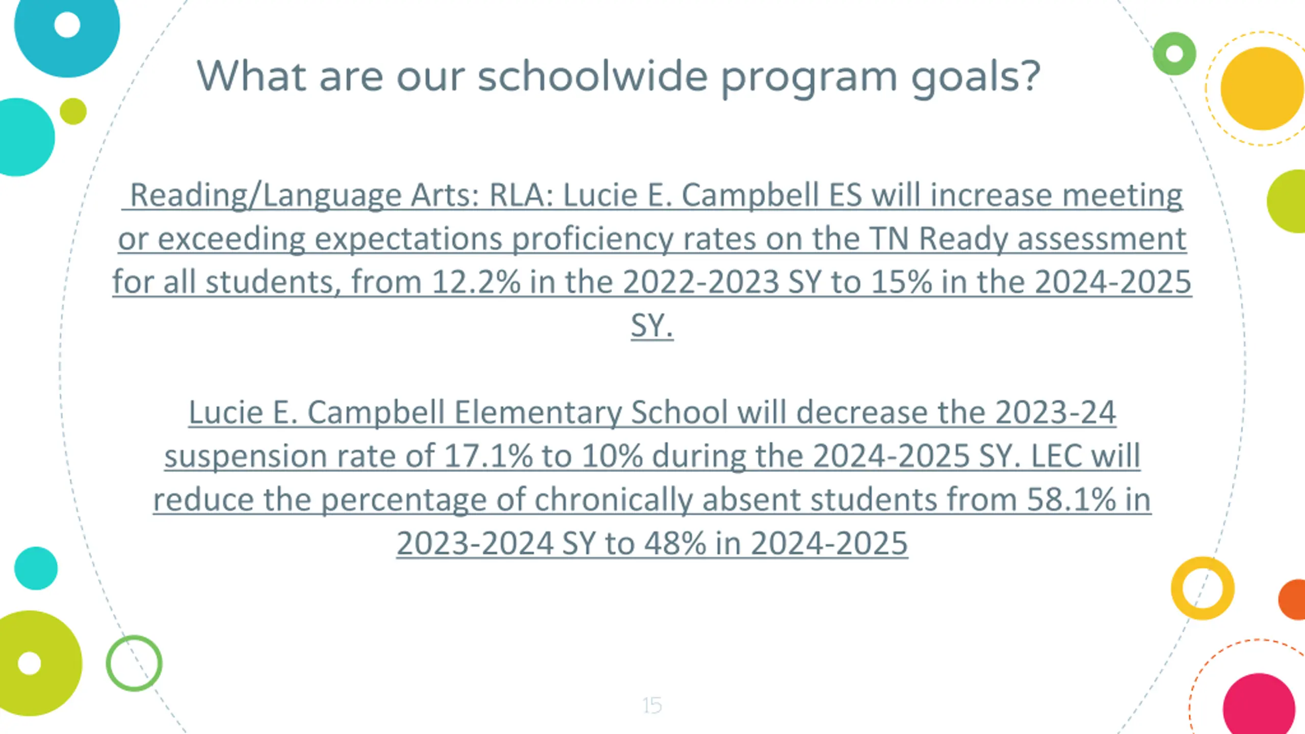 What are our schoolwide program goals? Reading/Language Arts: RLA: Lucie E. Campbell ES will increase meeting or exceeding expectations proficiency rates on the TN Ready assessment for all students, from 12.2% in the 2022-2023 SY to 15% in the 2024-2025 SY. Lucie E. Campbell Elementary School will decrease the 2023-24 suspension rate of 17.1% to 10% during the 2024-2025 SY. LEC will reduce the percentage of chronically absent students from 58.1% in 2023-2024 SY to 48% in 2024-2025 15