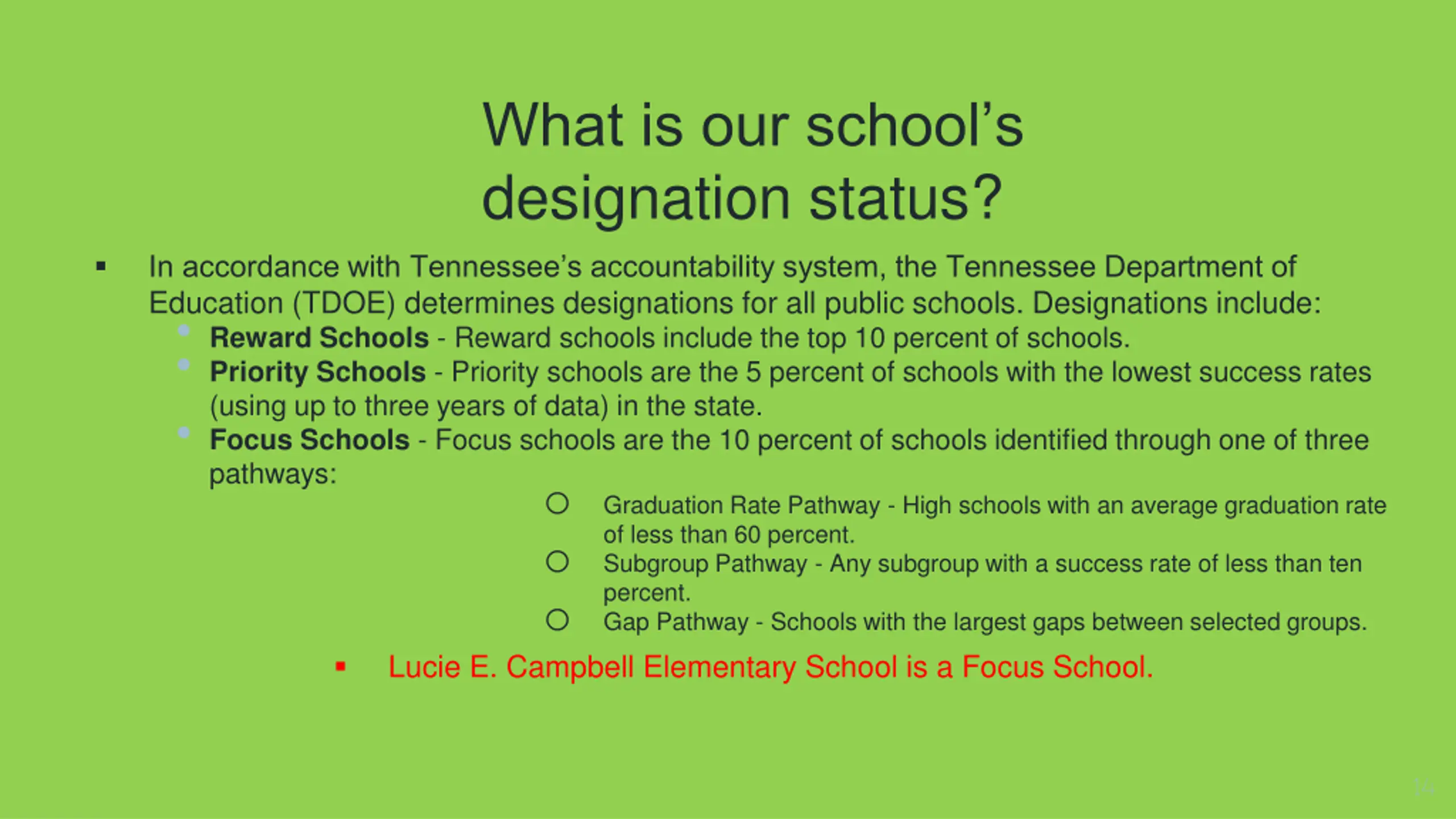 What is our schools designation status? In accordance with Tennessee s accountability system, the Tennessee Department of Education (TDOE) determines designations for all public schools. Designations include: Reward Schools - Reward schools include the top 10 percent of schools. Priority Schools - Priority schools are the 5 percent of schools with the lowest success rates (using up to three years of data) in the state. Focus Schools - Focus schools are the 10 percent of schools identified through one of three pathways: o of less than 60 percent. o percent. o Lucie E. Campbell Elementary School is a Focus School. Graduation Rate Pathway - High schools with an average graduation rate Subgroup Pathway - Any subgroup with a success rate of less than ten Gap Pathway - Schools with the largest gaps between selected groups. 14