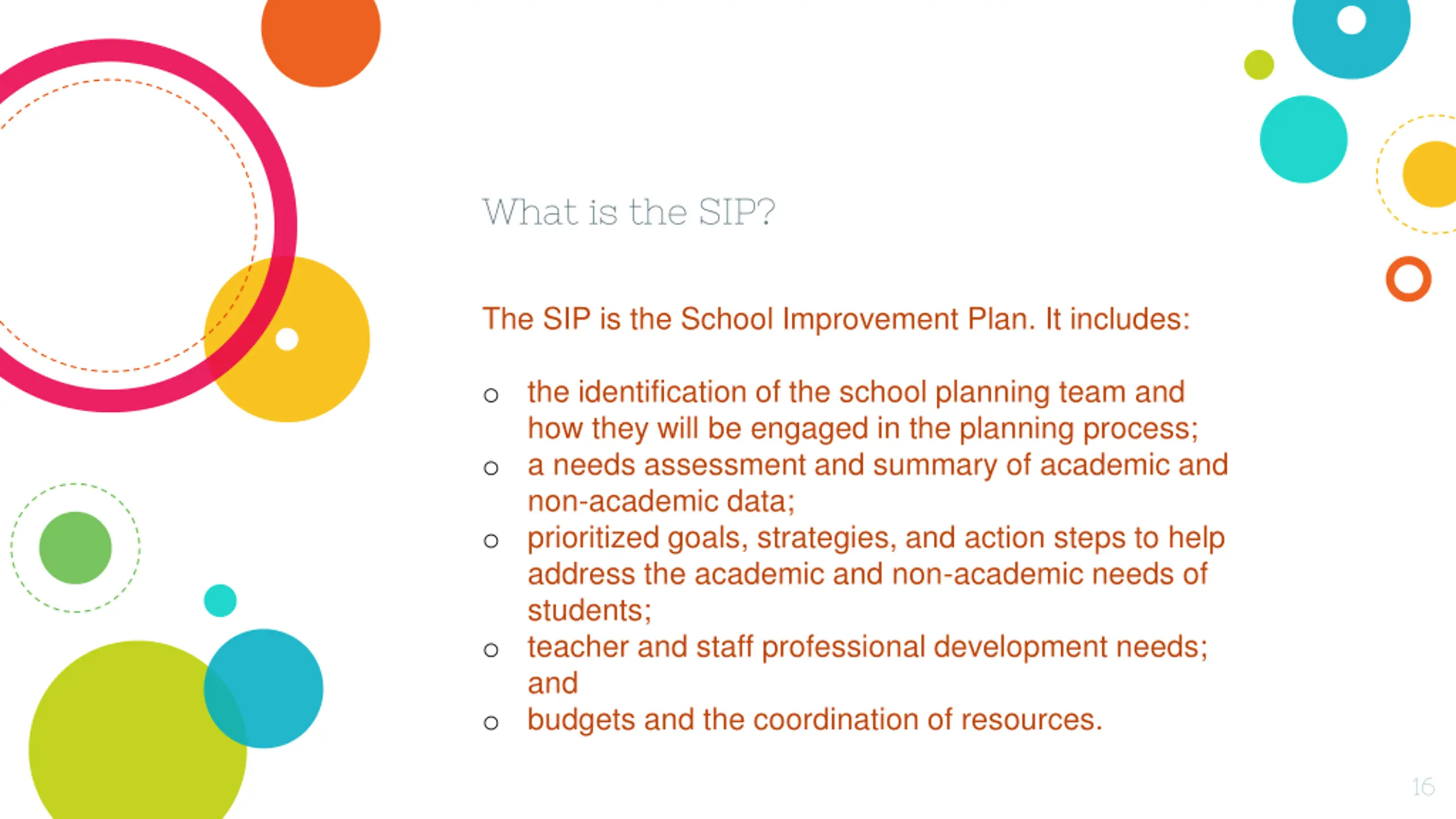 What is the SIP? The SIP is the School Improvement Plan. It includes: the identification of the school planning team and how they will be engaged in the planning process; a needs assessment and summary of academic and non-academic data; prioritized goals, strategies, and action steps to help address the academic and non-academic needs of students; teacher and staff professional development needs; and budgets and the coordination of resources. o o o o o 16
