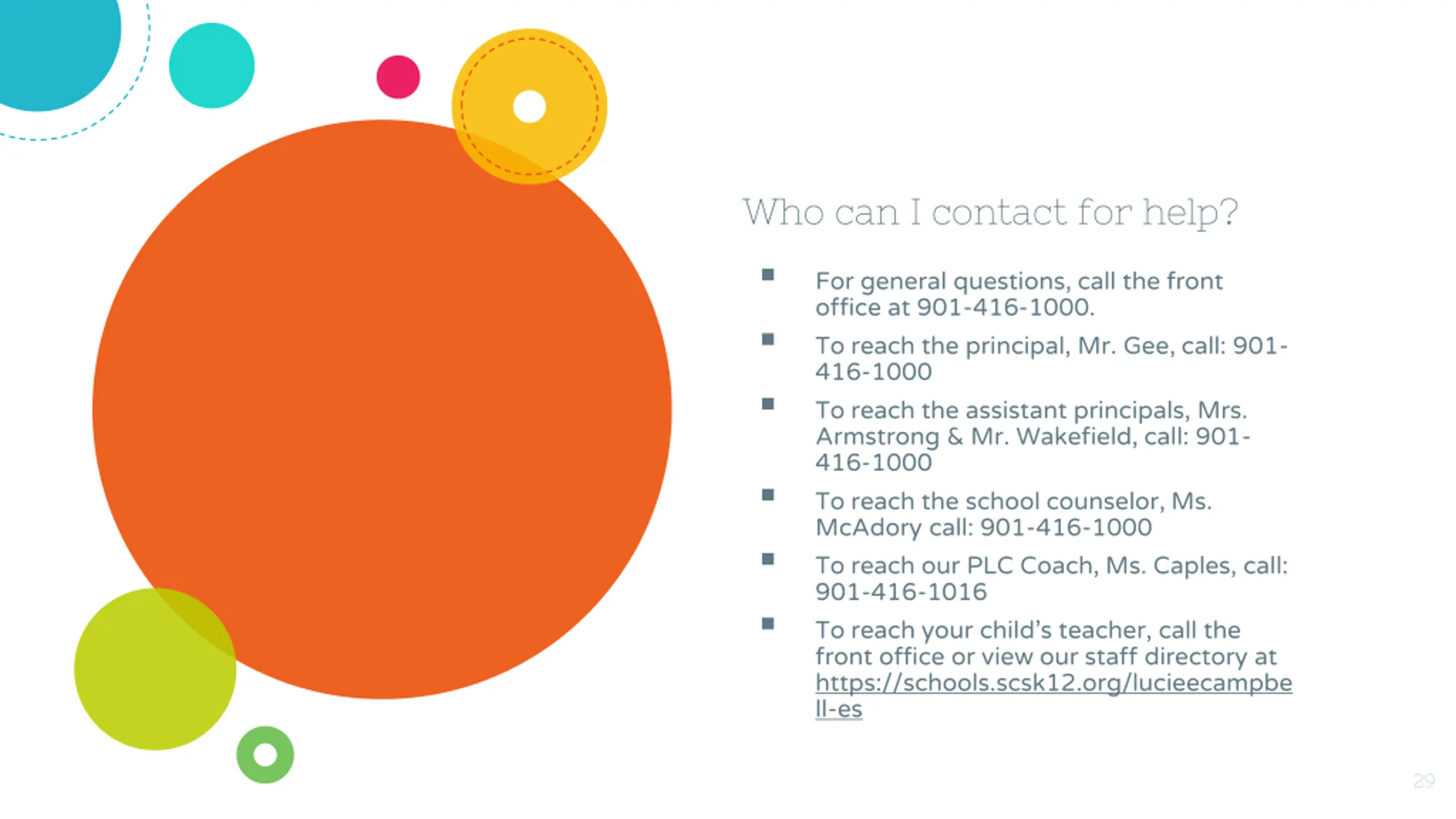Who can I contact for help? For general questions, call the front office at 901-416-1000. To reach the principal, Mr. Gee, call: 901- 416-1000 To reach the assistant principals, Mrs. Armstrong & Mr. Wakefield, call: 901- 416-1000 To reach the school counselor, Ms. McAdory call: 901-416-1000 To reach our PLC Coach, Ms. Caples, call: 901-416-1016 To reach your child s teacher, call the front office or view our staff directory at https://schools.scsk12.org/lucieecampbe ll-es 29