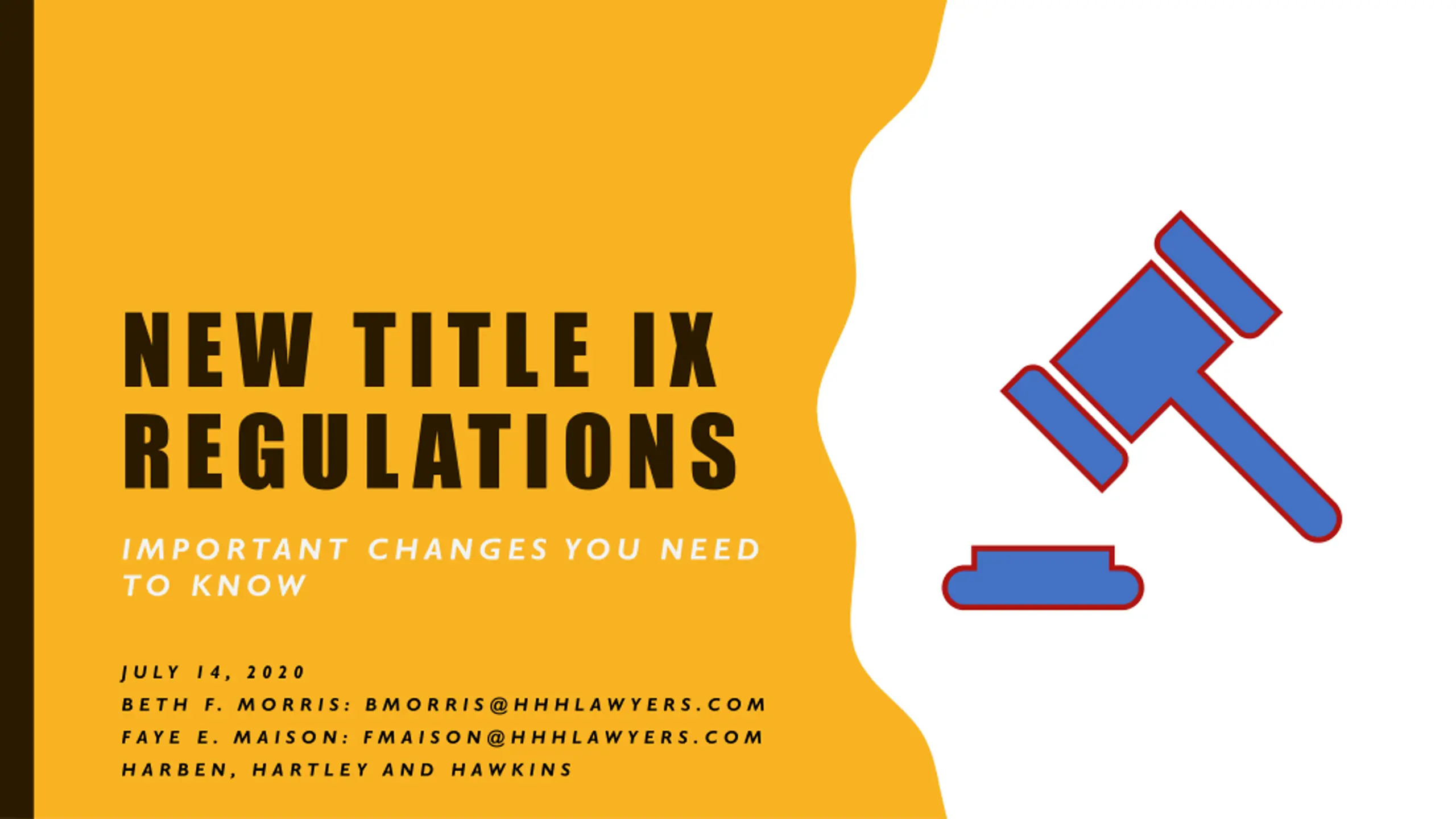 NEW TITLE IX REGULATIONS IMPORTANT CHANGES YOU NEED TO KNOW J U L Y 1 4 , 2 0 2 0 B E T H F . M O R R I S : B M O R R I S @ H H H L A W Y E R S . C O M F A Y E E . M A I S O N : F M A I S O N @ H H H L A W Y E R S . C O M H A R B E N , H A R T L E Y A N D H A W K I N S