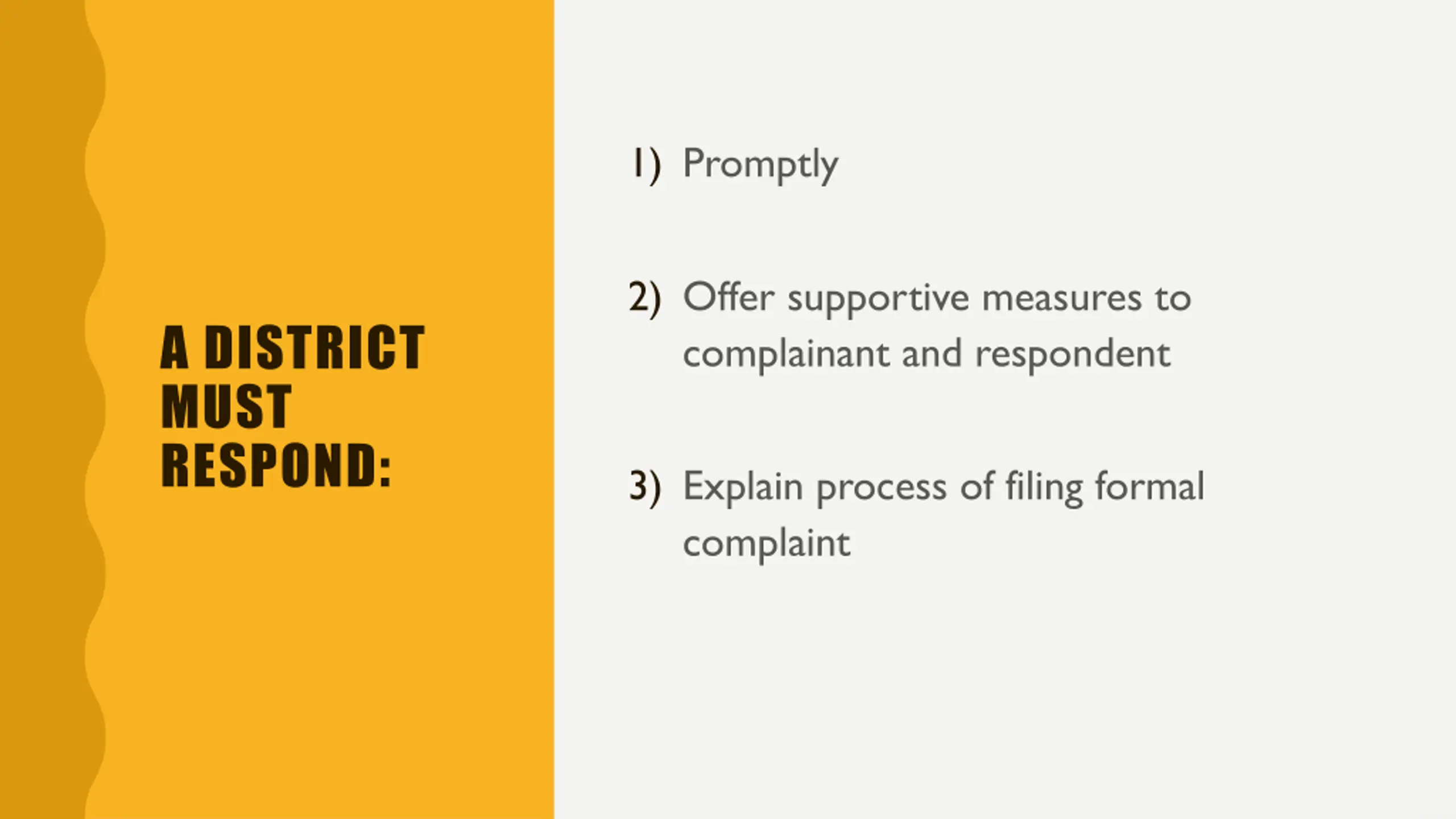 1) Promptly 2) Offer supportive measures to complainant and respondent A DISTRICT MUST RESPOND: 3) Explain process of filing formal complaint
