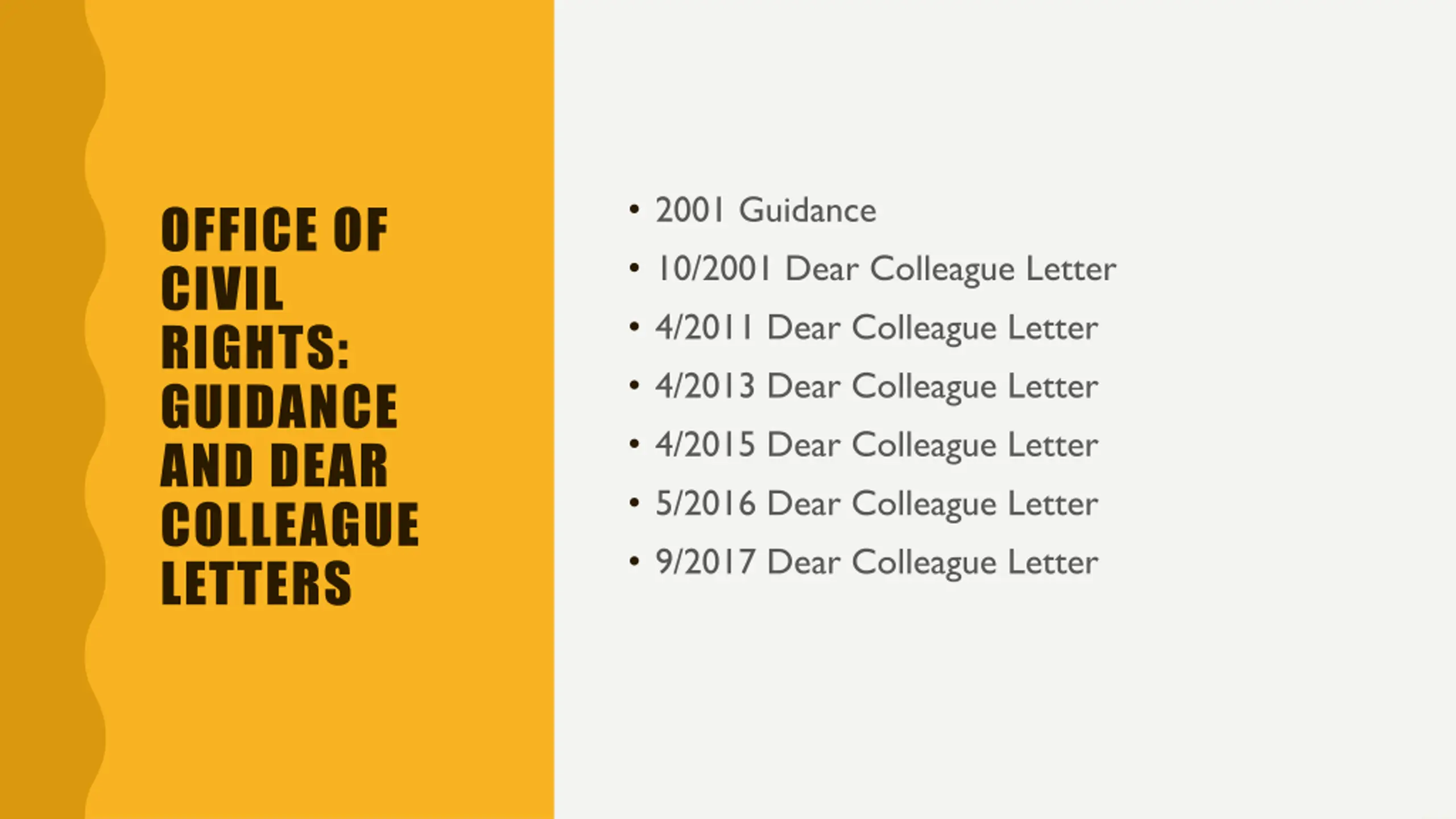 2001 Guidance 10/2001 Dear Colleague Letter 4/2011 Dear Colleague Letter 4/2013 Dear Colleague Letter 4/2015 Dear Colleague Letter 5/2016 Dear Colleague Letter 9/2017 Dear Colleague Letter OFFICE OF CIVIL RIGHTS: GUIDANCE AND DEAR COLLEAGUE LETTERS
