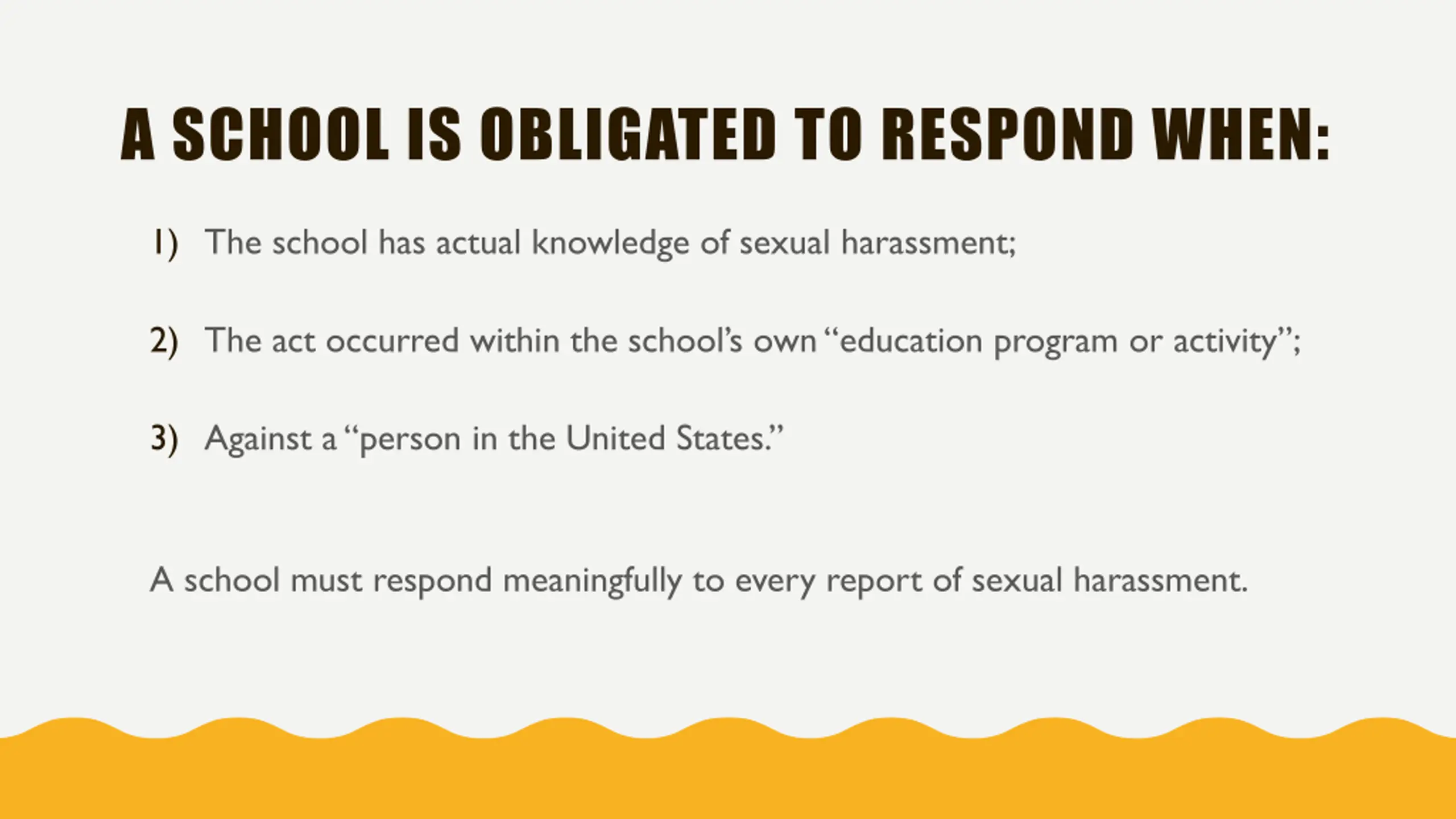 A SCHOOL IS OBLIGATED TO RESPOND WHEN: 1) The school has actual knowledge of sexual harassment; 2) The act occurred within the school s own education program or activity ; 3) Against a person in the United States. A school must respond meaningfully to every report of sexual harassment.