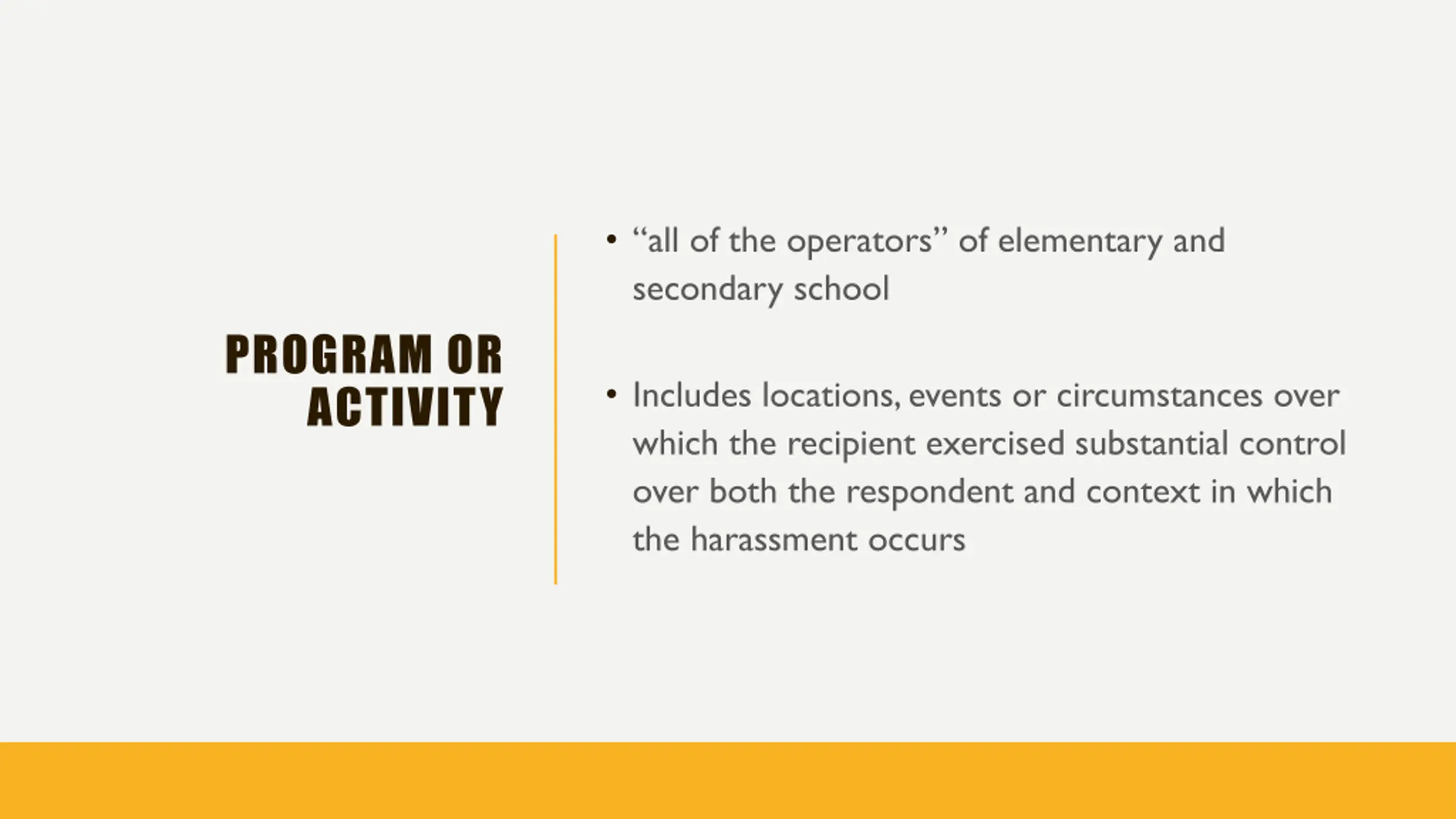 all of the operators of elementary and secondary school PROGRAM OR ACTIVITY Includes locations, events or circumstances over which the recipient exercised substantial control over both the respondent and context in which the harassment occurs