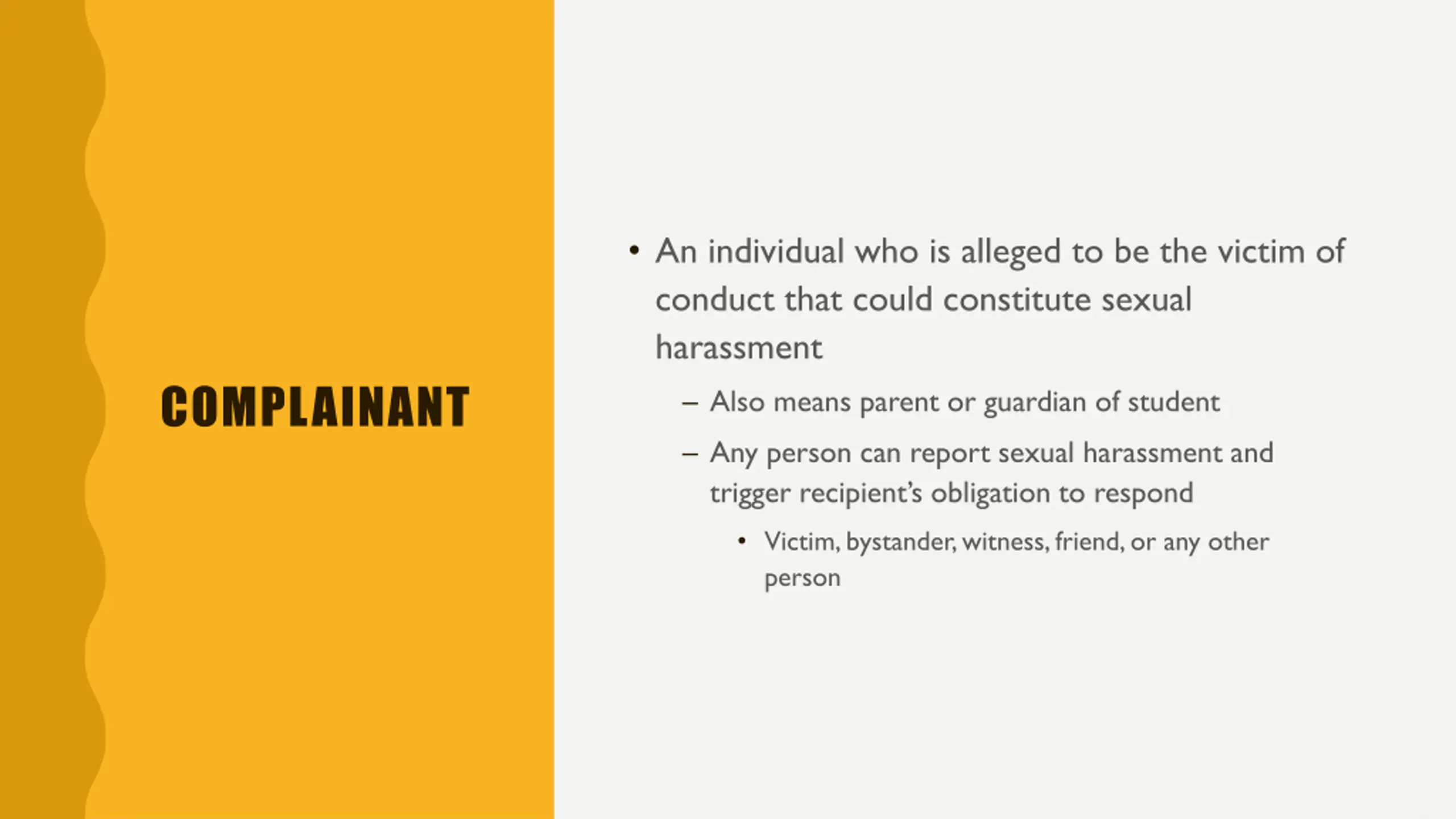An individual who is alleged to be the victim of conduct that could constitute sexual harassment COMPLAINANT Also means parent or guardian of student Any person can report sexual harassment and trigger recipient s obligation to respond Victim, bystander, witness, friend, or any other person