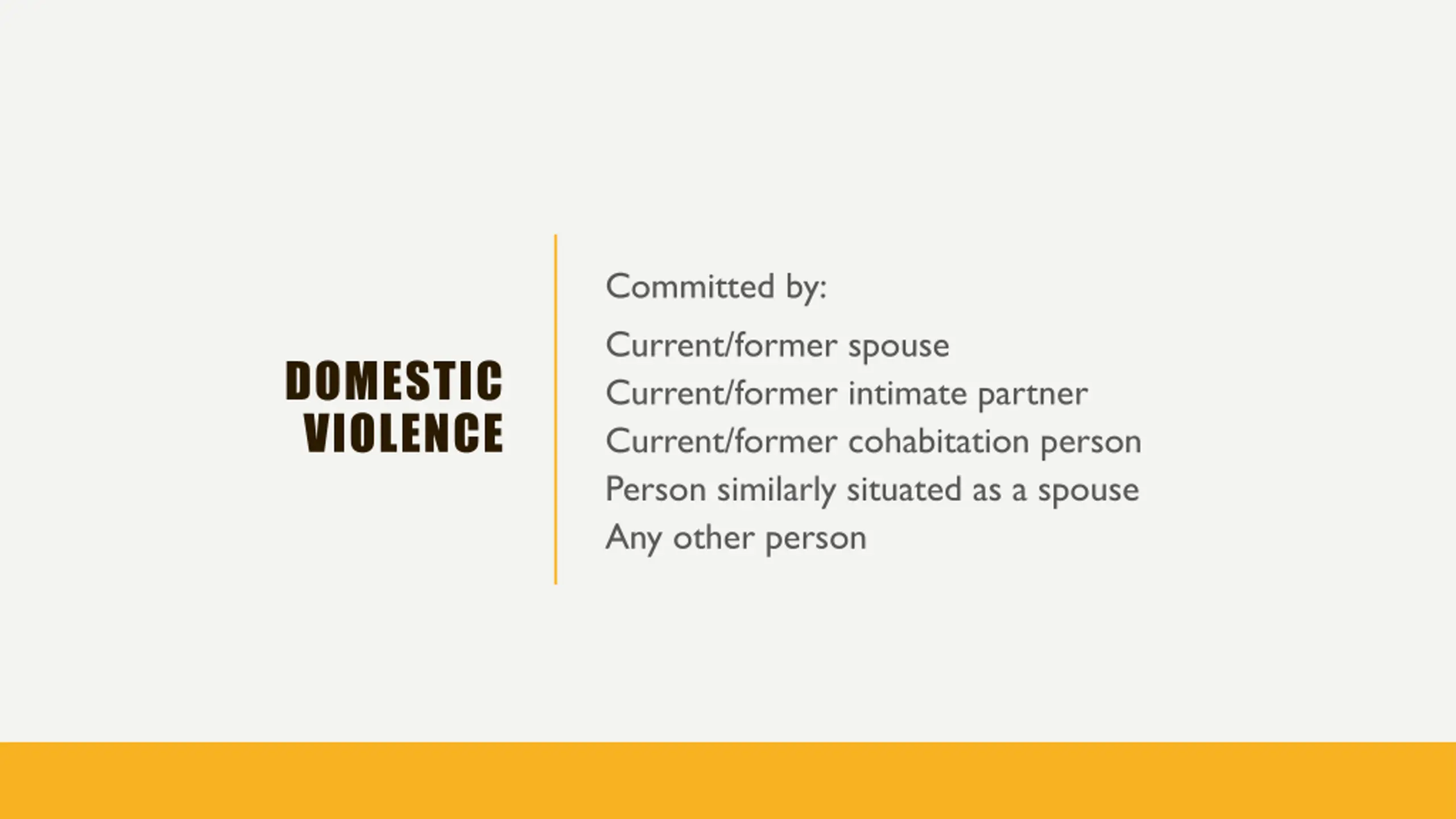 Committed by: Current/former spouse Current/former intimate partner Current/former cohabitation person Person similarly situated as a spouse Any other person DOMESTIC VIOLENCE