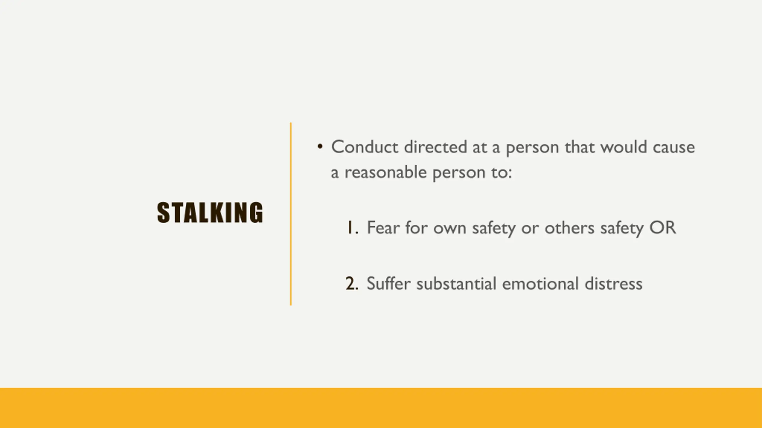 Conduct directed at a person that would cause a reasonable person to: STALKING 1. Fear for own safety or others safety OR 2. Suffer substantial emotional distress