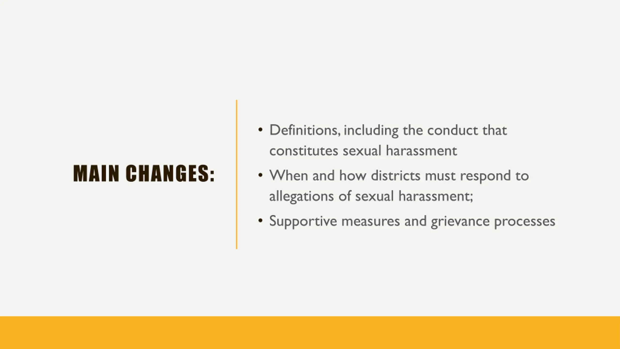 Definitions, including the conduct that constitutes sexual harassment When and how districts must respond to allegations of sexual harassment; Supportive measures and grievance processes MAIN CHANGES: