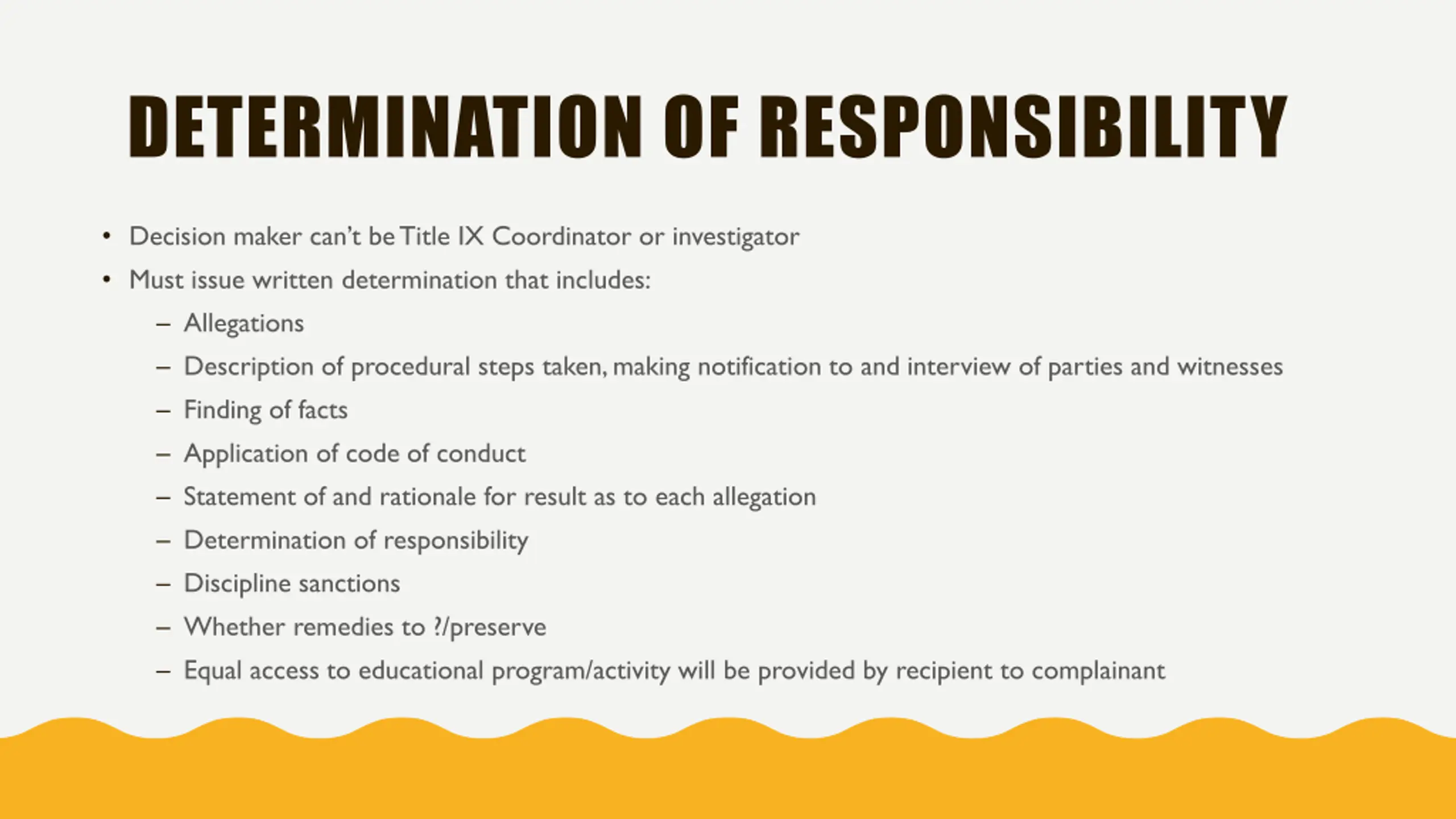 DETERMINATION OF RESPONSIBILITY Decision maker can t be Title IX Coordinator or investigator Must issue written determination that includes: Allegations Description of procedural steps taken, making notification to and interview of parties and witnesses Finding of facts Application of code of conduct Statement of and rationale for result as to each allegation Determination of responsibility Discipline sanctions Whether remedies to ?/preserve Equal access to educational program/activity will be provided by recipient to complainant