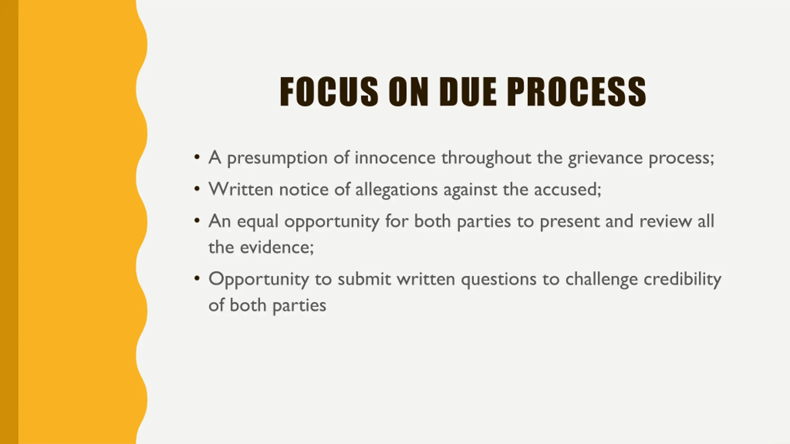 FOCUS ON DUE PROCESS A presumption of innocence throughout the grievance process; Written notice of allegations against the accused; An equal opportunity for both parties to present and review all the evidence; Opportunity to submit written questions to challenge credibility of both parties