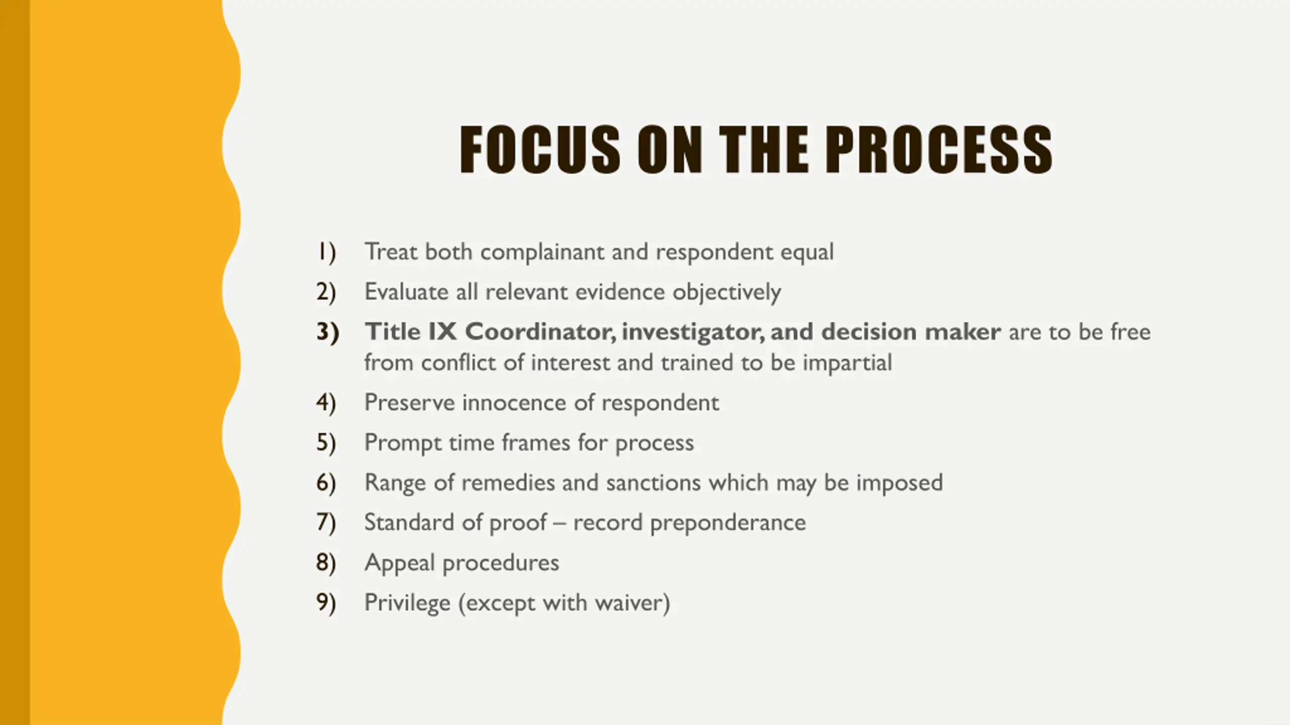 FOCUS ON THE PROCESS 1) 2) 3) Treat both complainant and respondent equal Evaluate all relevant evidence objectively Title IX Coordinator, investigator, and decision maker are to be free from conflict of interest and trained to be impartial Preserve innocence of respondent Prompt time frames for process Range of remedies and sanctions which may be imposed Standard of proof record preponderance Appeal procedures Privilege (except with waiver) 4) 5) 6) 7) 8) 9)