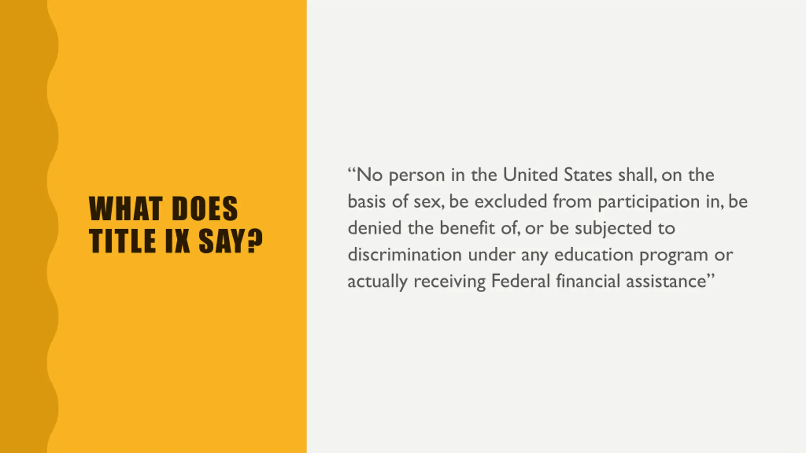 No person in the United States shall, on the basis of sex, be excluded from participation in, be denied the benefit of, or be subjected to discrimination under any education program or actually receiving Federal financial assistance WHAT DOES TITLE IX SAY?