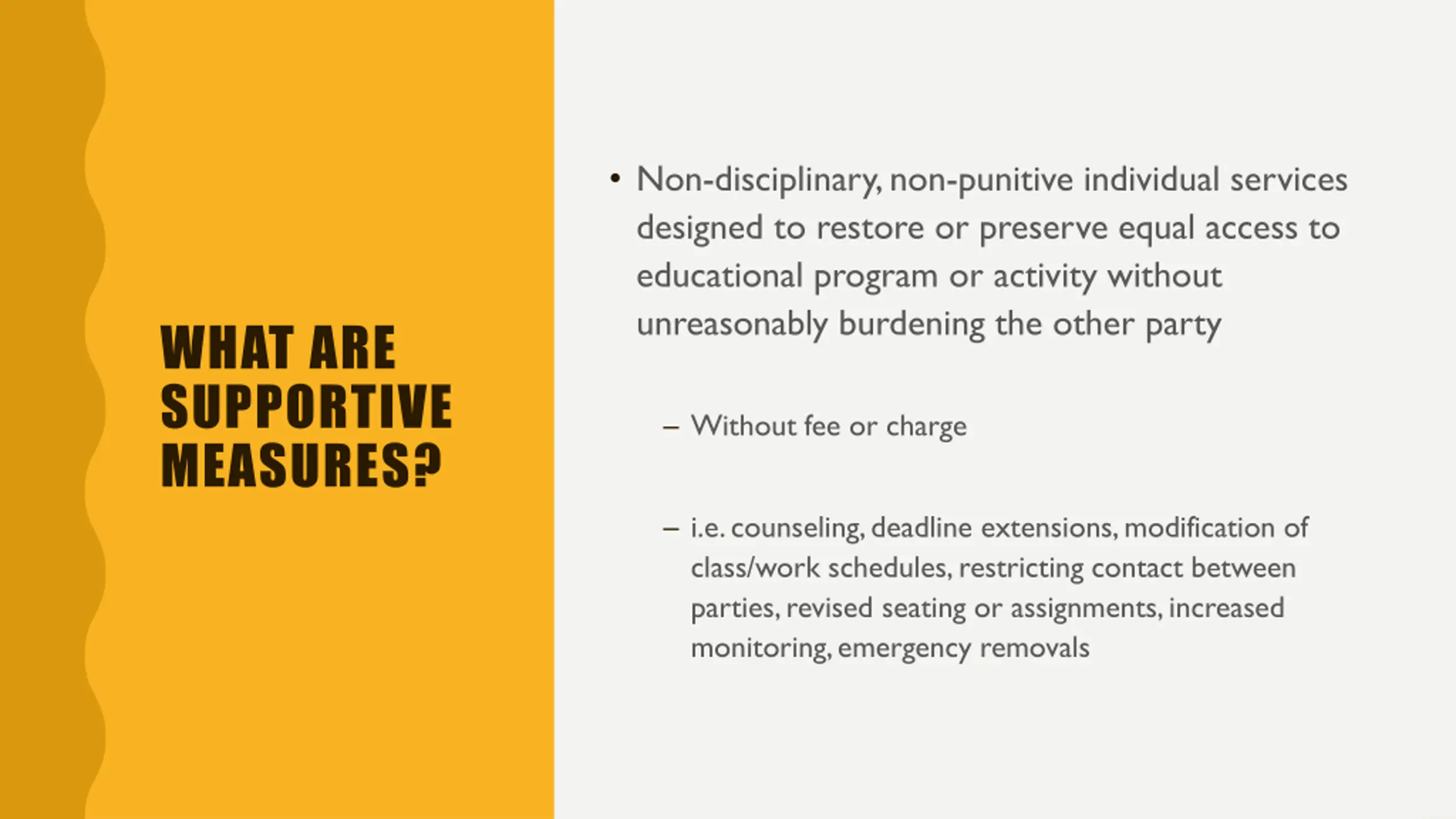Non-disciplinary, non-punitive individual services designed to restore or preserve equal access to educational program or activity without unreasonably burdening the other party WHAT ARE SUPPORTIVE MEASURES? Without fee or charge i.e. counseling, deadline extensions, modification of class/work schedules, restricting contact between parties, revised seating or assignments, increased monitoring, emergency removals