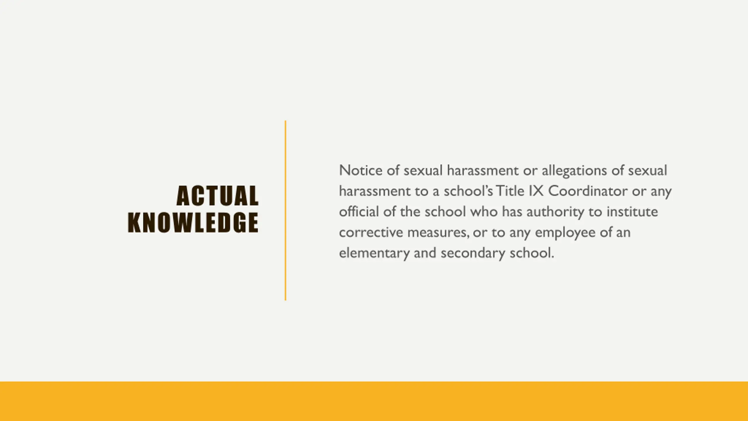 Notice of sexual harassment or allegations of sexual harassment to a school s Title IX Coordinator or any official of the school who has authority to institute corrective measures, or to any employee of an elementary and secondary school. ACTUAL KNOWLEDGE