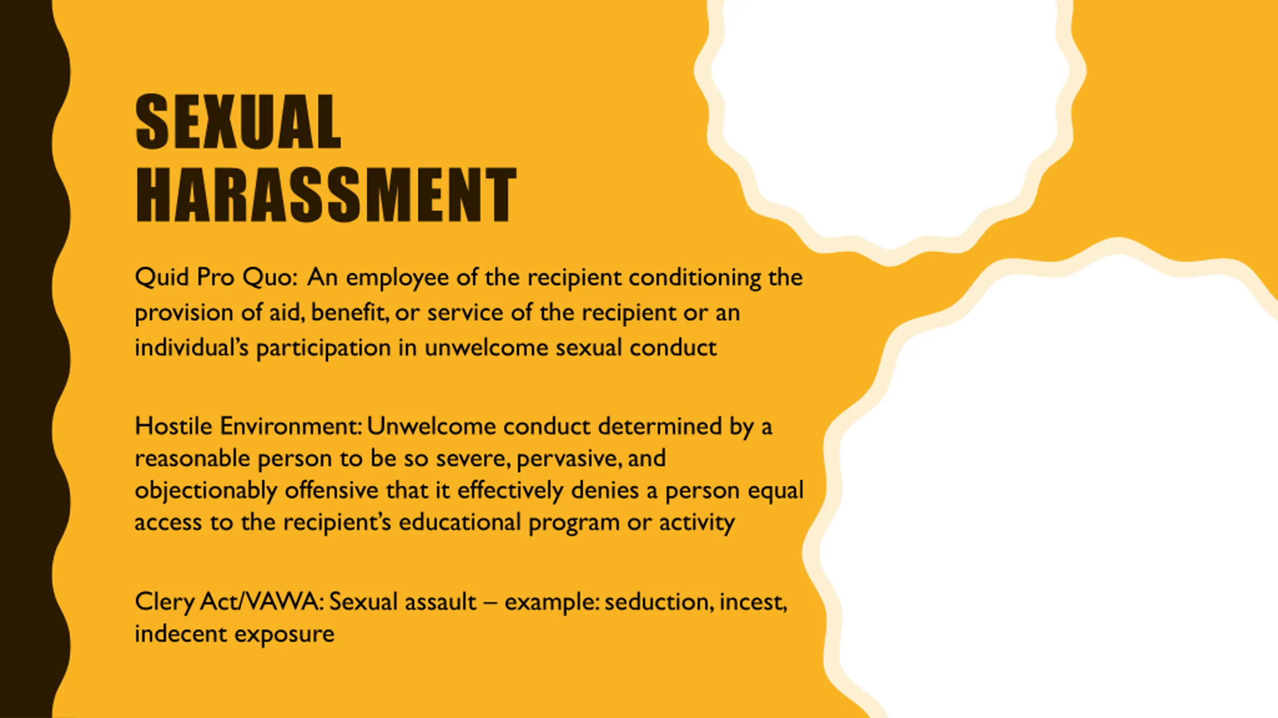 SEXUAL HARASSMENT Quid Pro Quo: An employee of the recipient conditioning the provision of aid, benefit, or service of the recipient or an individual s participation in unwelcome sexual conduct Hostile Environment: Unwelcome conduct determined by a reasonable person to be so severe, pervasive, and objectionably offensive that it effectively denies a person equal access to the recipient s educational program or activity Clery Act/VAWA: Sexual assault example: seduction, incest, indecent exposure