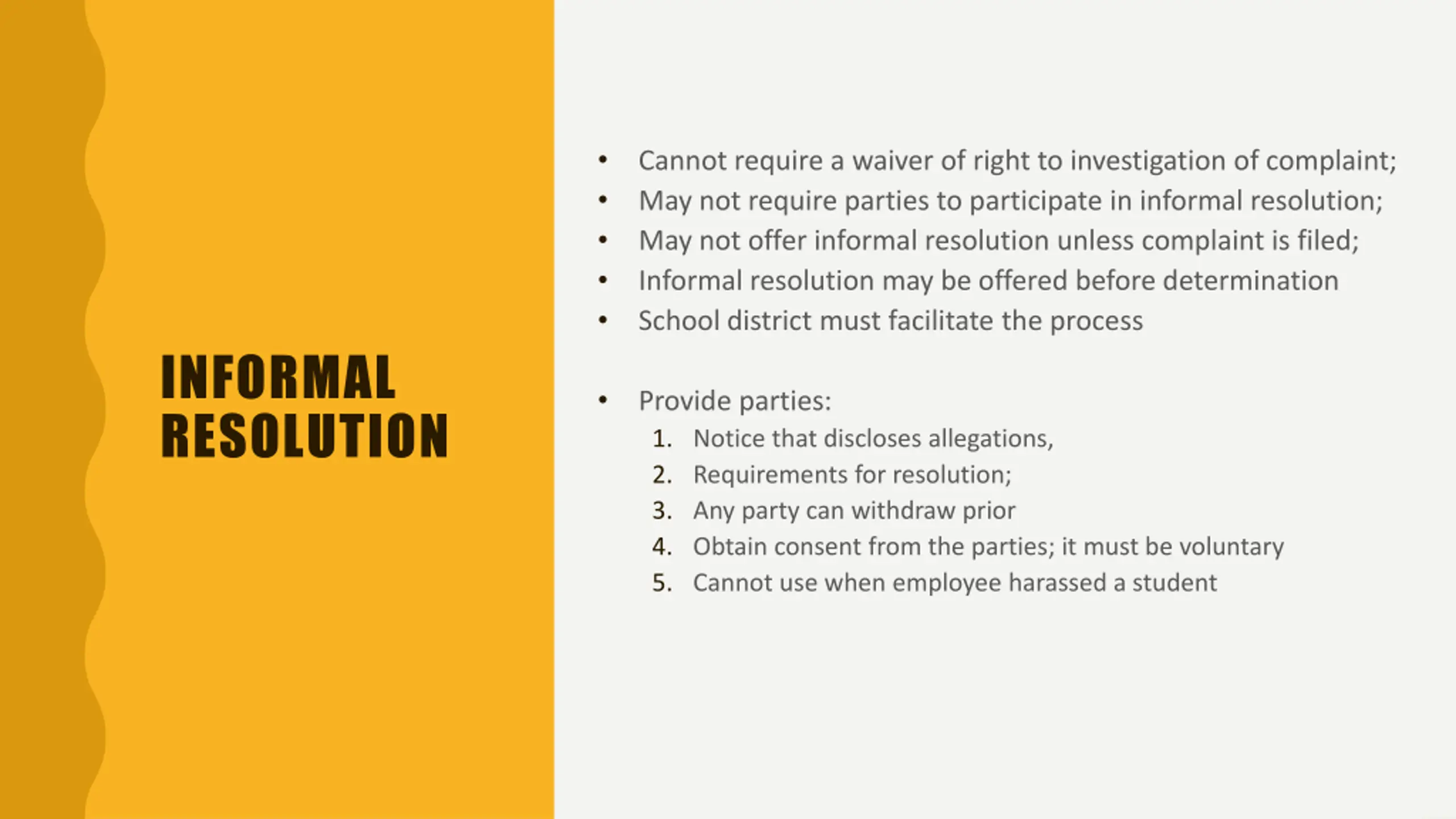 Cannot require a waiver of right to investigation of complaint; May not require parties to participate in informal resolution; May not offer informal resolution unless complaint is filed; Informal resolution may be offered before determination School district must facilitate the process INFORMAL RESOLUTION Provide parties: 1. Notice that discloses allegations, 2. Requirements for resolution; 3. Any party can withdraw prior 4. Obtain consent from the parties; it must be voluntary 5. Cannot use when employee harassed a student