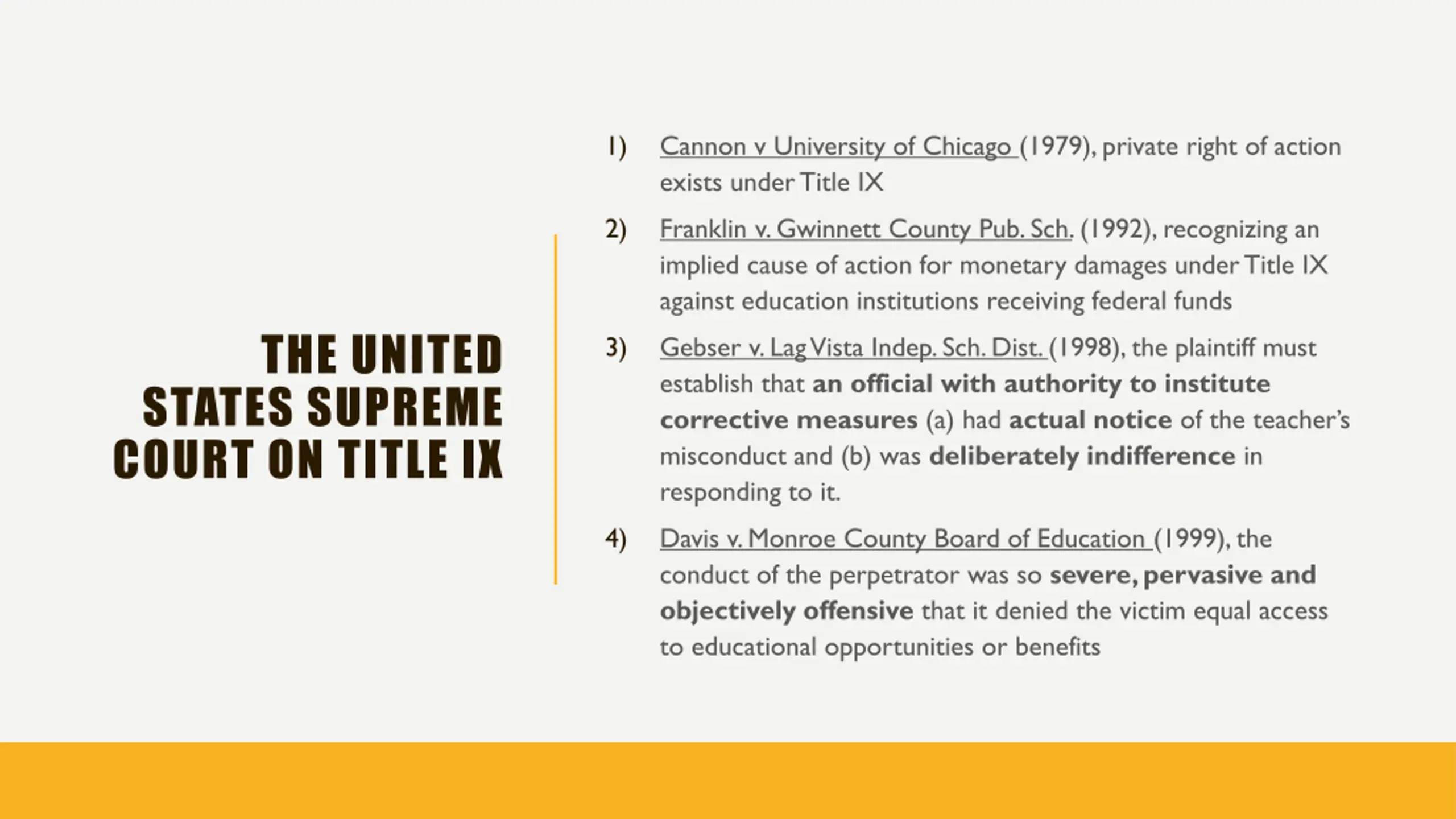 1) Cannon v University of Chicago (1979), private right of action exists under Title IX 2) Franklin v. Gwinnett County Pub. Sch.(1992), recognizing an implied cause of action for monetary damages under Title IX against education institutions receiving federal funds THE UNITED STATES SUPREME COURT ON TITLE IX 3) Gebser v. Lag Vista Indep. Sch. Dist. (1998), the plaintiff must establish that an official with authority to institute corrective measures (a) had actual notice of the teacher s misconduct and (b) was deliberately indifference in responding to it. 4) Davis v. Monroe County Board of Education (1999), the conduct of the perpetrator was so severe, pervasive and objectively offensive that it denied the victim equal access to educational opportunities or benefits