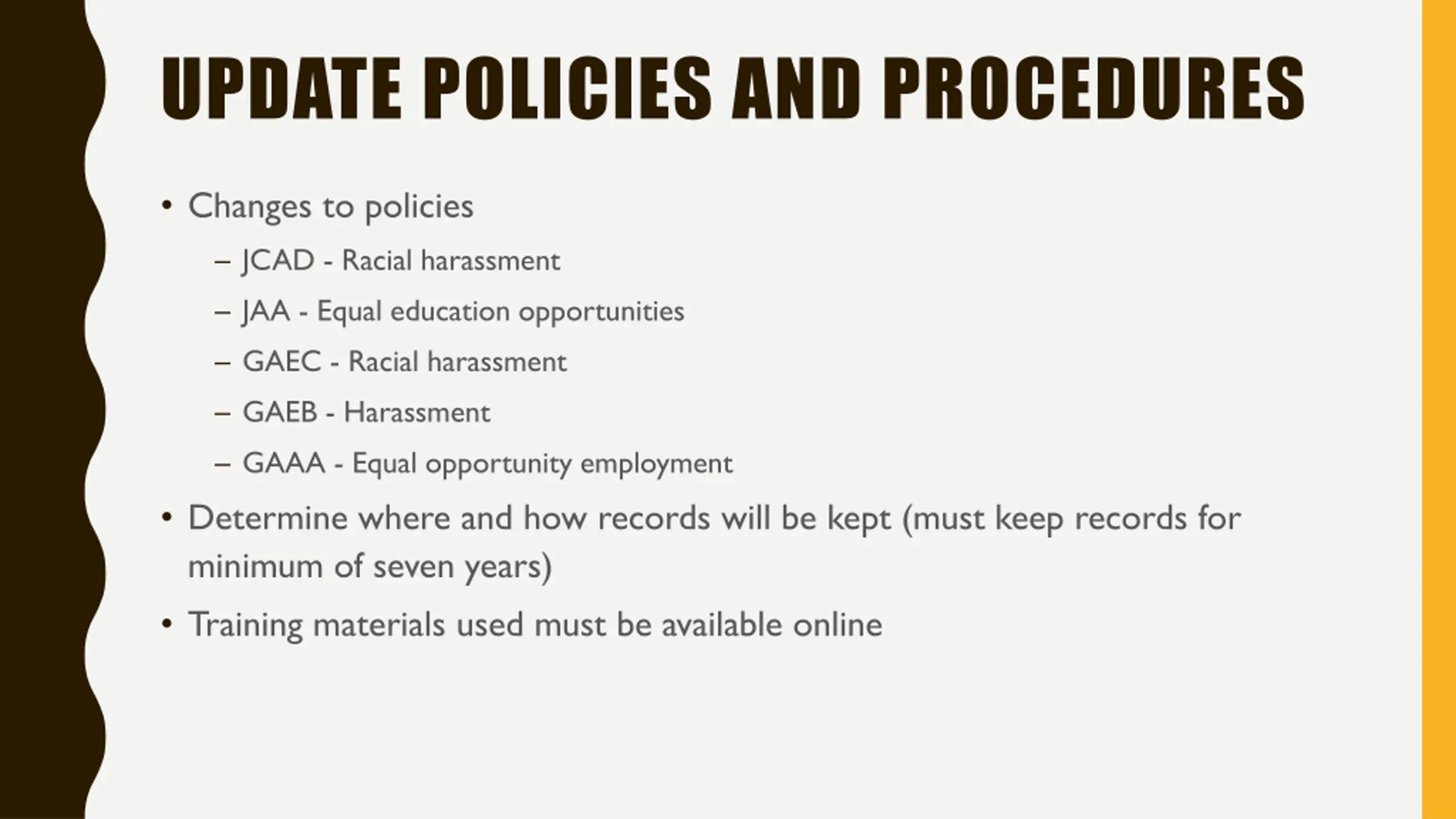 UPDATE POLICIES AND PROCEDURES Changes to policies JCAD - Racial harassment JAA - Equal education opportunities GAEC - Racial harassment GAEB - Harassment GAAA - Equal opportunity employment Determine where and how records will be kept (must keep records for minimum of seven years) Training materials used must be available online