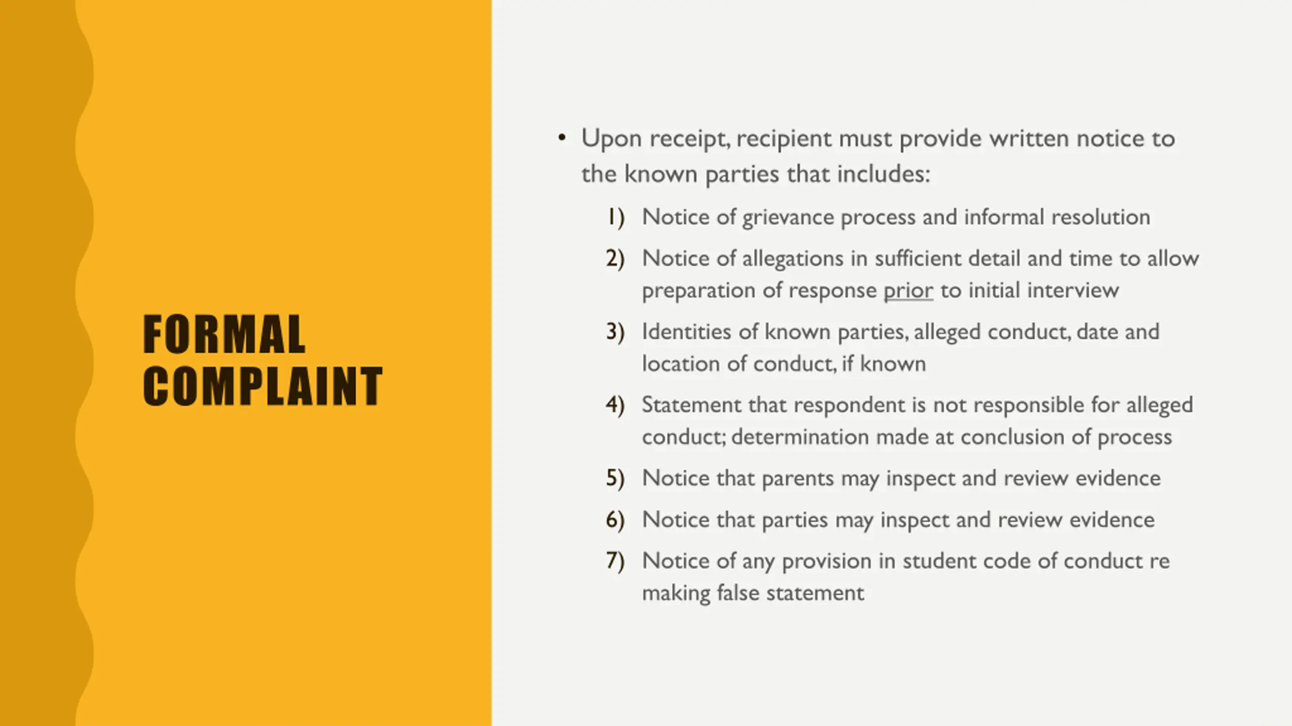 Upon receipt, recipient must provide written notice to the known parties that includes: 1) Notice of grievance process and informal resolution 2) Notice of allegations in sufficient detail and time to allow preparation of response prior to initial interview FORMAL COMPLAINT 3) Identities of known parties, alleged conduct, date and location of conduct, if known 4) Statement that respondent is not responsible for alleged conduct; determination made at conclusion of process 5) Notice that parents may inspect and review evidence 6) Notice that parties may inspect and review evidence 7) Notice of any provision in student code of conduct re making false statement
