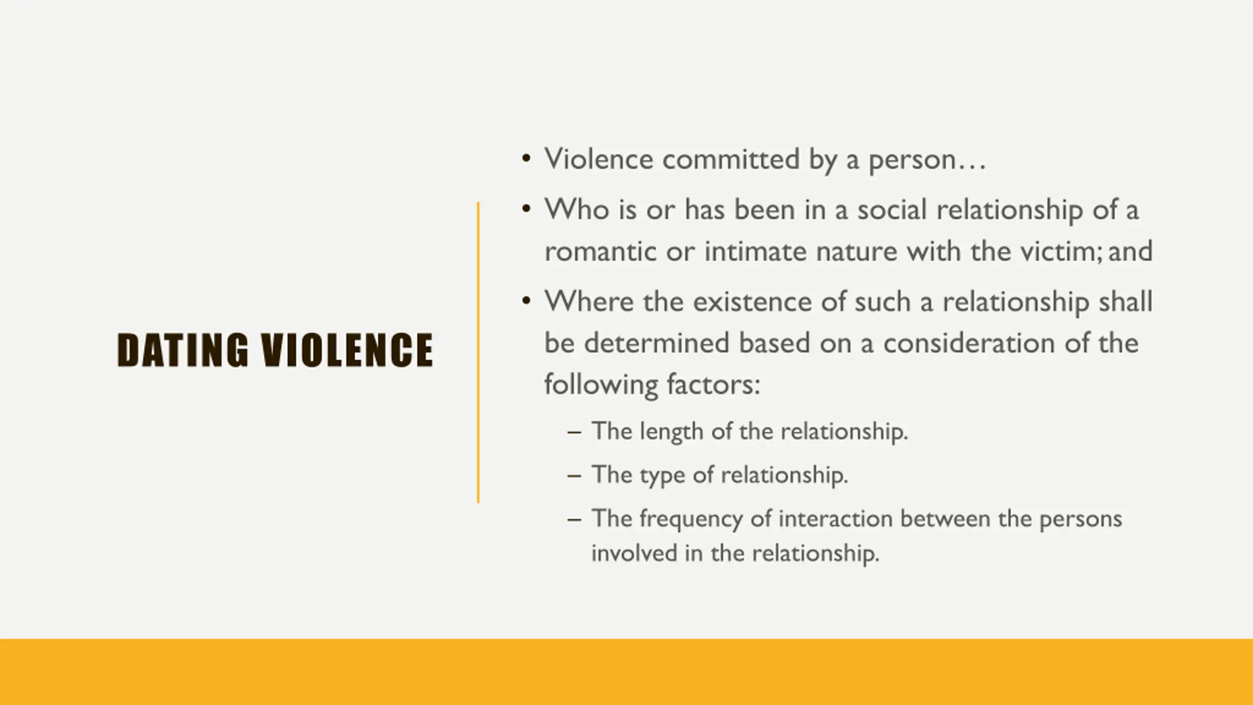 Violence committed by a person Who is or has been in a social relationship of a romantic or intimate nature with the victim; and Where the existence of such a relationship shall be determined based on a consideration of the following factors: DATING VIOLENCE The length of the relationship. The type of relationship. The frequency of interaction between the persons involved in the relationship.