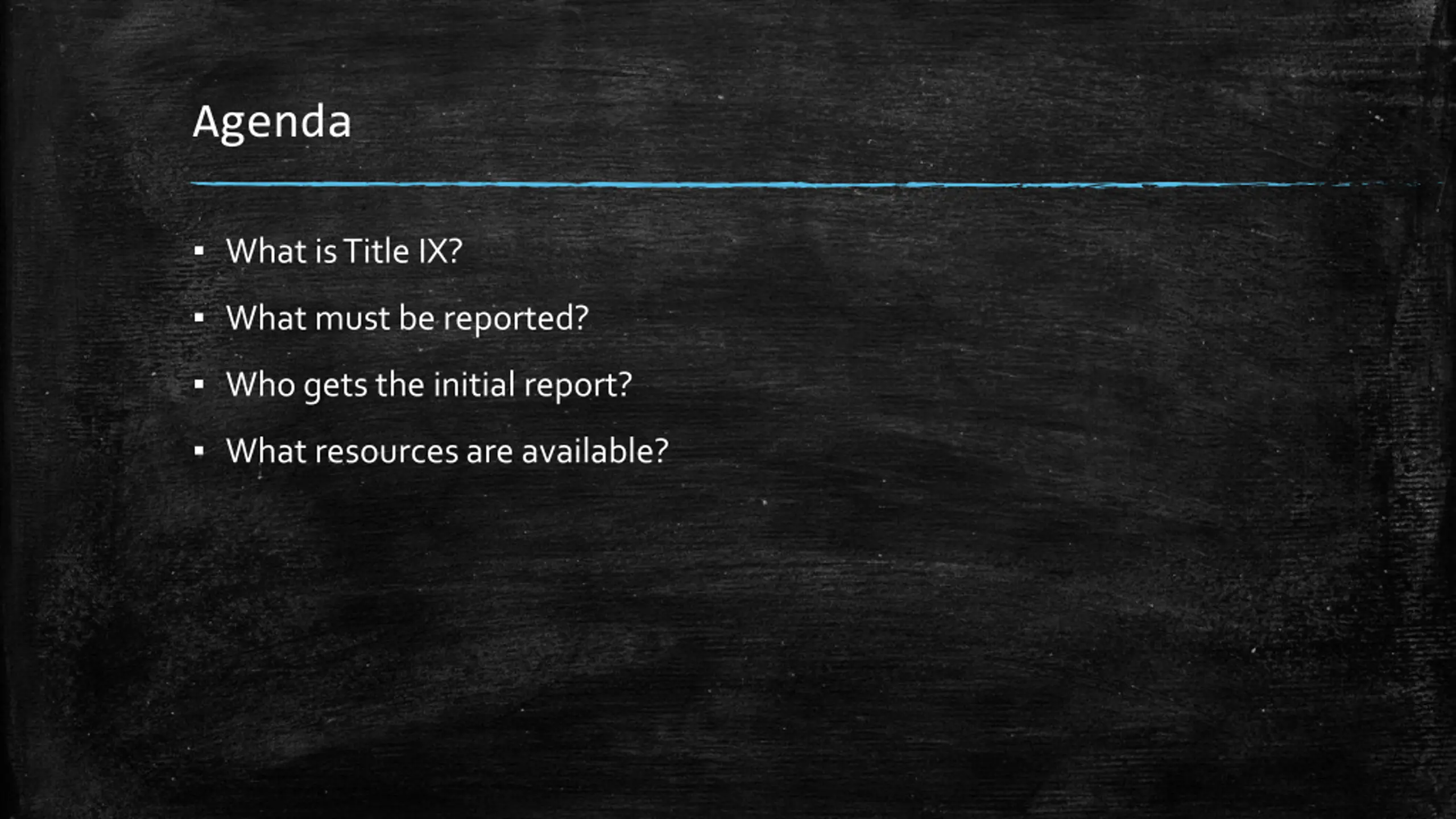 Agenda What is Title IX? What must be reported? Who gets the initial report? What resources are available?