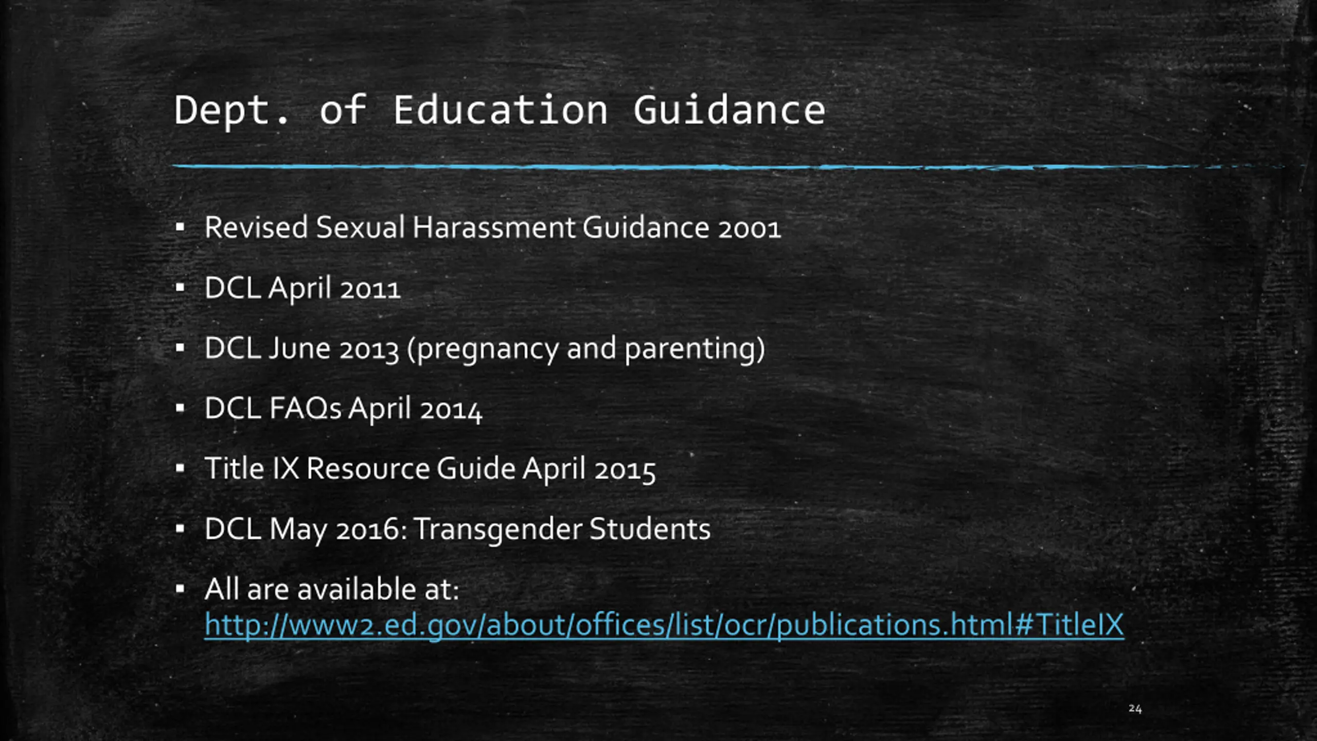 Dept. of Education Guidance Revised Sexual Harassment Guidance 2001 DCL April 2011 DCL June 2013 (pregnancy and parenting) DCL FAQs April 2014 Title IX Resource Guide April 2015 DCL May 2016: Transgender Students All are available at: http://www2.ed.gov/about/offices/list/ocr/publications.html#TitleIX 24