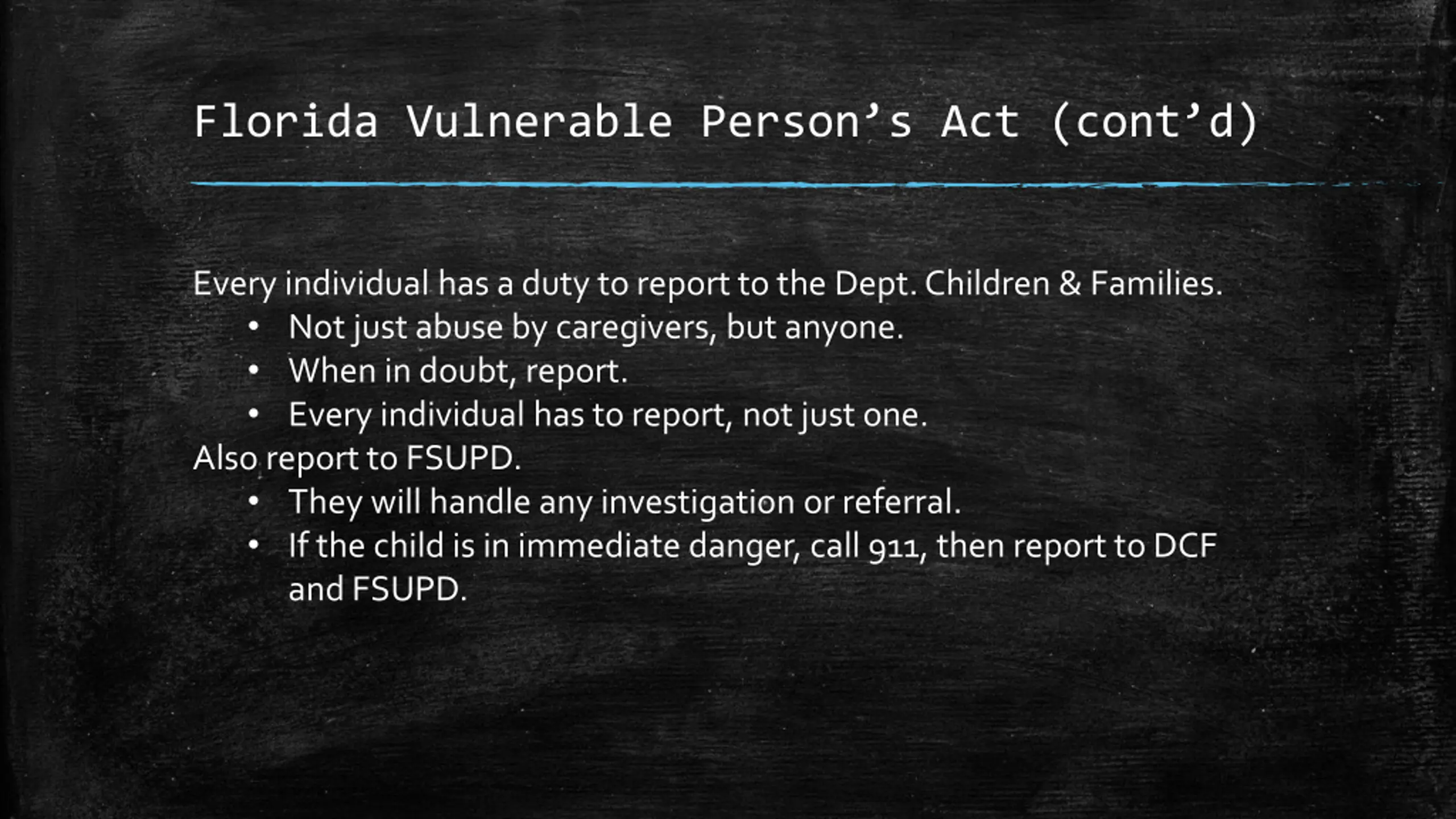 Florida Vulnerable Persons Act (contd) Every individual has a duty to report to the Dept. Children & Families. Not just abuse by caregivers, but anyone. When in doubt, report. Every individual has to report, not just one. Also report to FSUPD. They will handle any investigation or referral. If the child is in immediate danger, call 911, then report to DCF and FSUPD.