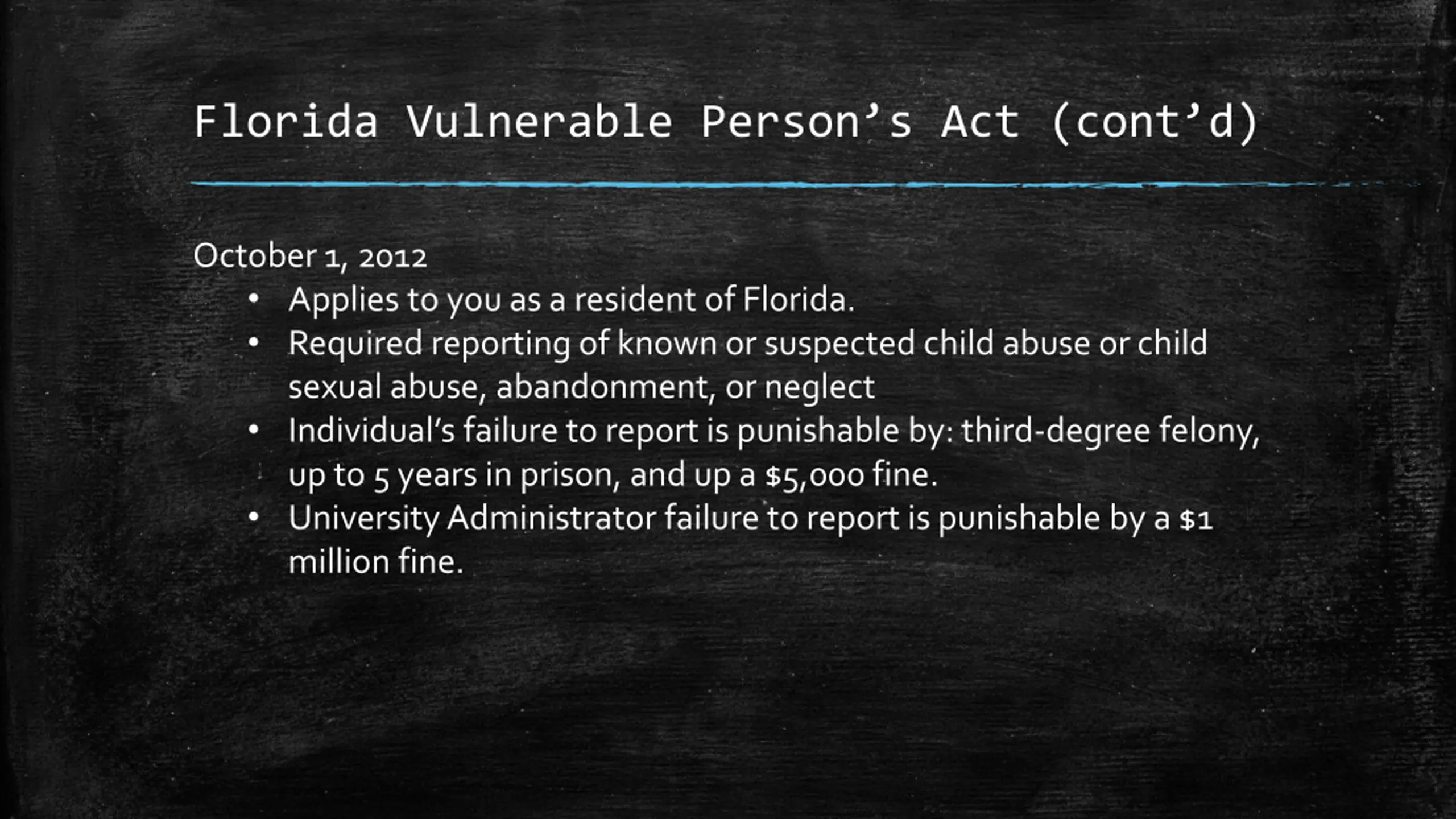 Florida Vulnerable Persons Act (contd) October 1, 2012 Applies to you as a resident of Florida. Required reporting of known or suspected child abuse or child sexual abuse, abandonment, or neglect Individual s failure to report is punishable by: third-degree felony, up to 5 years in prison, and up a $5,000 fine. University Administrator failure to report is punishable by a $1 million fine.