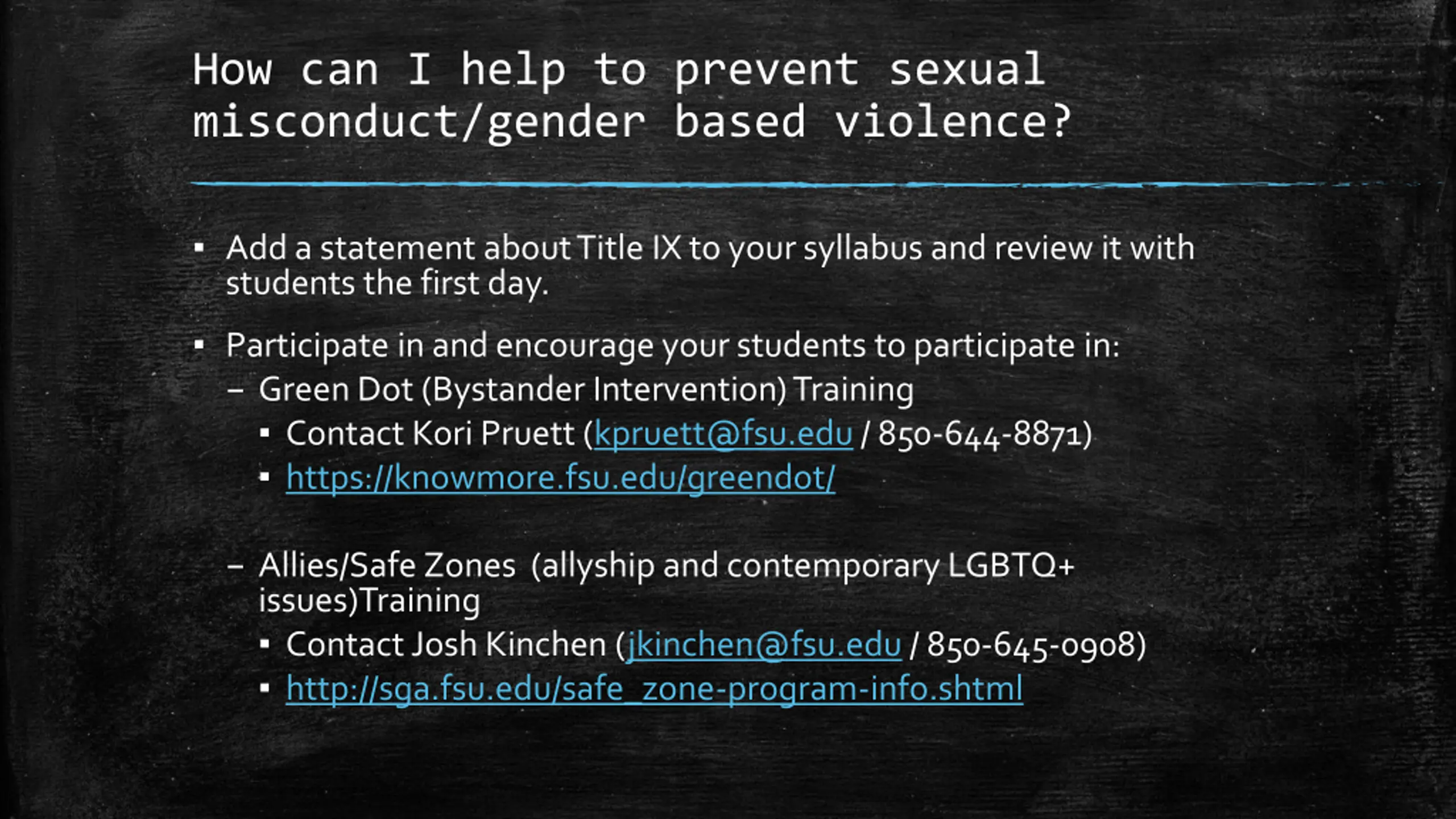 How can I help to prevent sexual misconduct/gender based violence? Add a statement about Title IX to your syllabus and review it with students the first day. Participate in and encourage your students to participate in: Green Dot (Bystander Intervention) Training Contact Kori Pruett (kpruett@fsu.edu / 850-644-8871) https://knowmore.fsu.edu/greendot/ Allies/Safe Zones (allyship and contemporary LGBTQ+ issues)Training Contact Josh Kinchen (jkinchen@fsu.edu / 850-645-0908) http://sga.fsu.edu/safe_zone-program-info.shtml