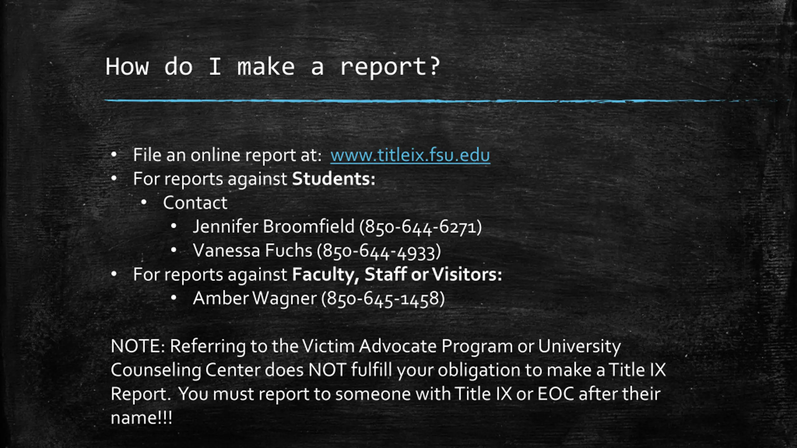 How do I make a report? File an online report at: www.titleix.fsu.edu For reports against Students: Contact Jennifer Broomfield (850-644-6271) Vanessa Fuchs (850-644-4933) For reports against Faculty, Staff or Visitors: Amber Wagner (850-645-1458) NOTE: Referring to the Victim Advocate Program or University Counseling Center does NOT fulfill your obligation to make a Title IX Report. You must report to someone with Title IX or EOC after their name!!!