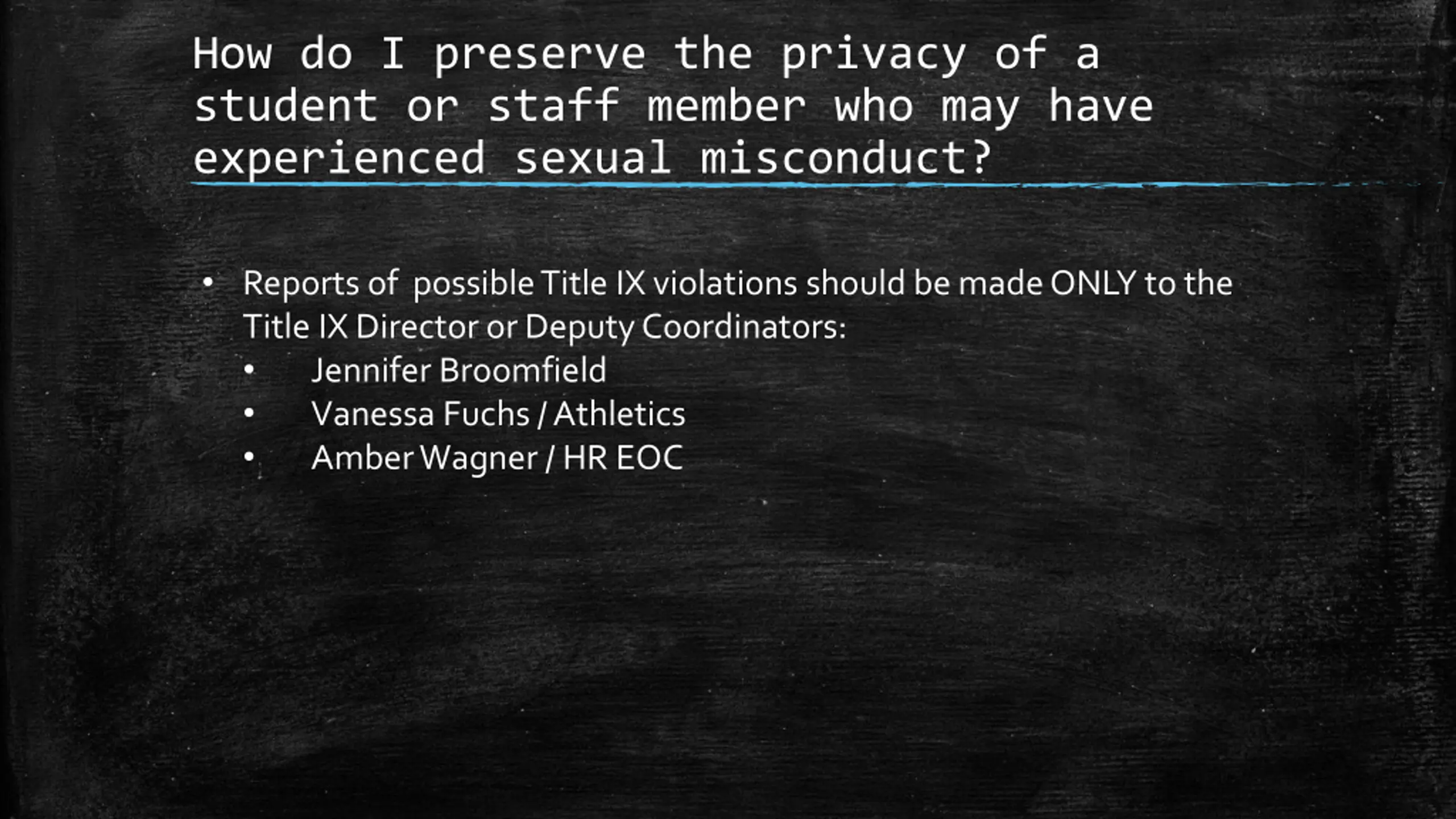 How do I preserve the privacy of a student or staff member who may have experienced sexual misconduct? Reports of possible Title IX violations should be made ONLY to the Title IX Director or Deputy Coordinators: Jennifer Broomfield Vanessa Fuchs / Athletics Amber Wagner / HR EOC