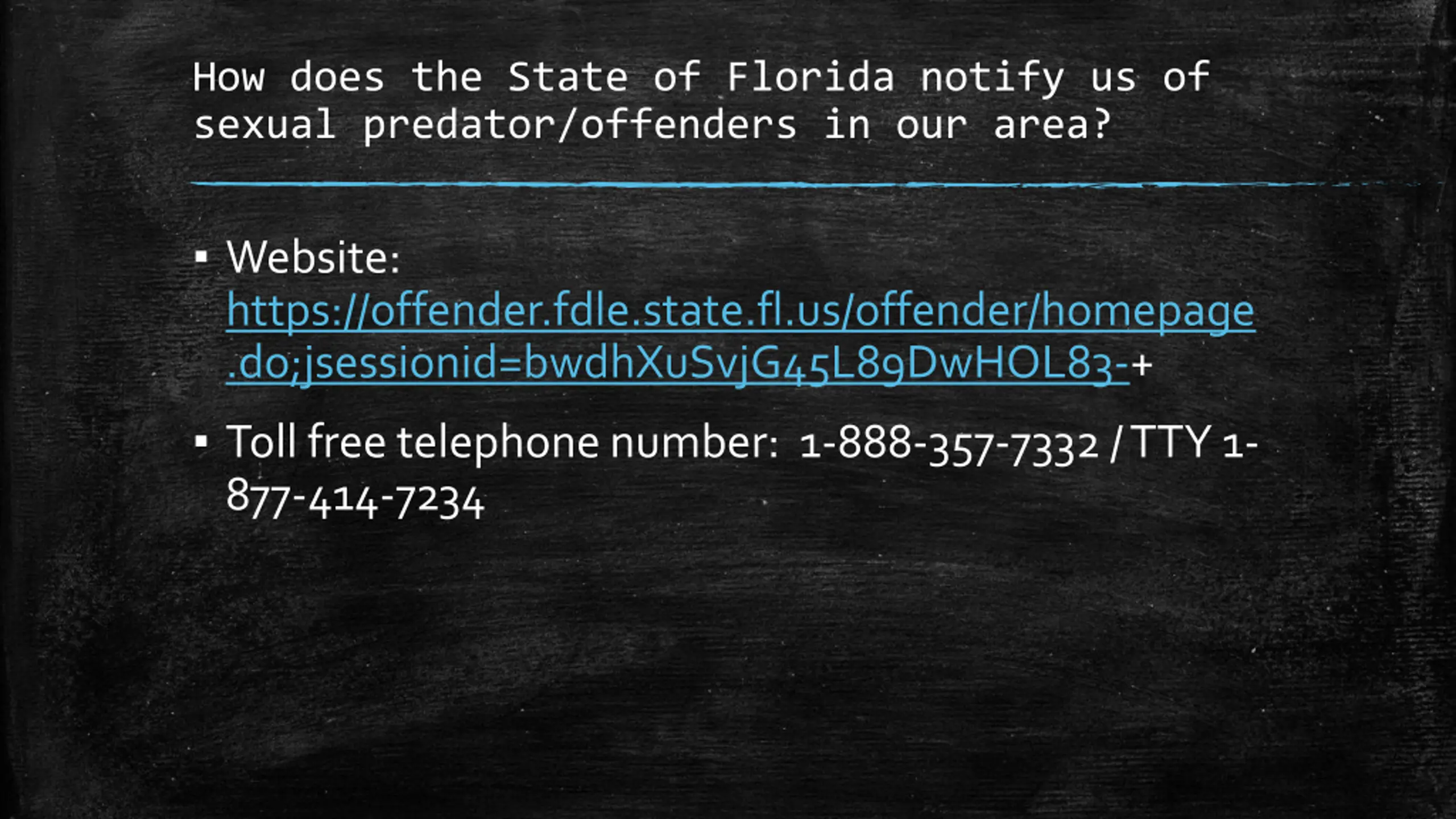 How does the State of Florida notify us of sexual predator/offenders in our area? Website: https://offender.fdle.state.fl.us/offender/homepage .do;jsessionid=bwdhXuSvjG45L89DwHOL83-+ Toll free telephone number: 1-888-357-7332 / TTY 1- 877-414-7234