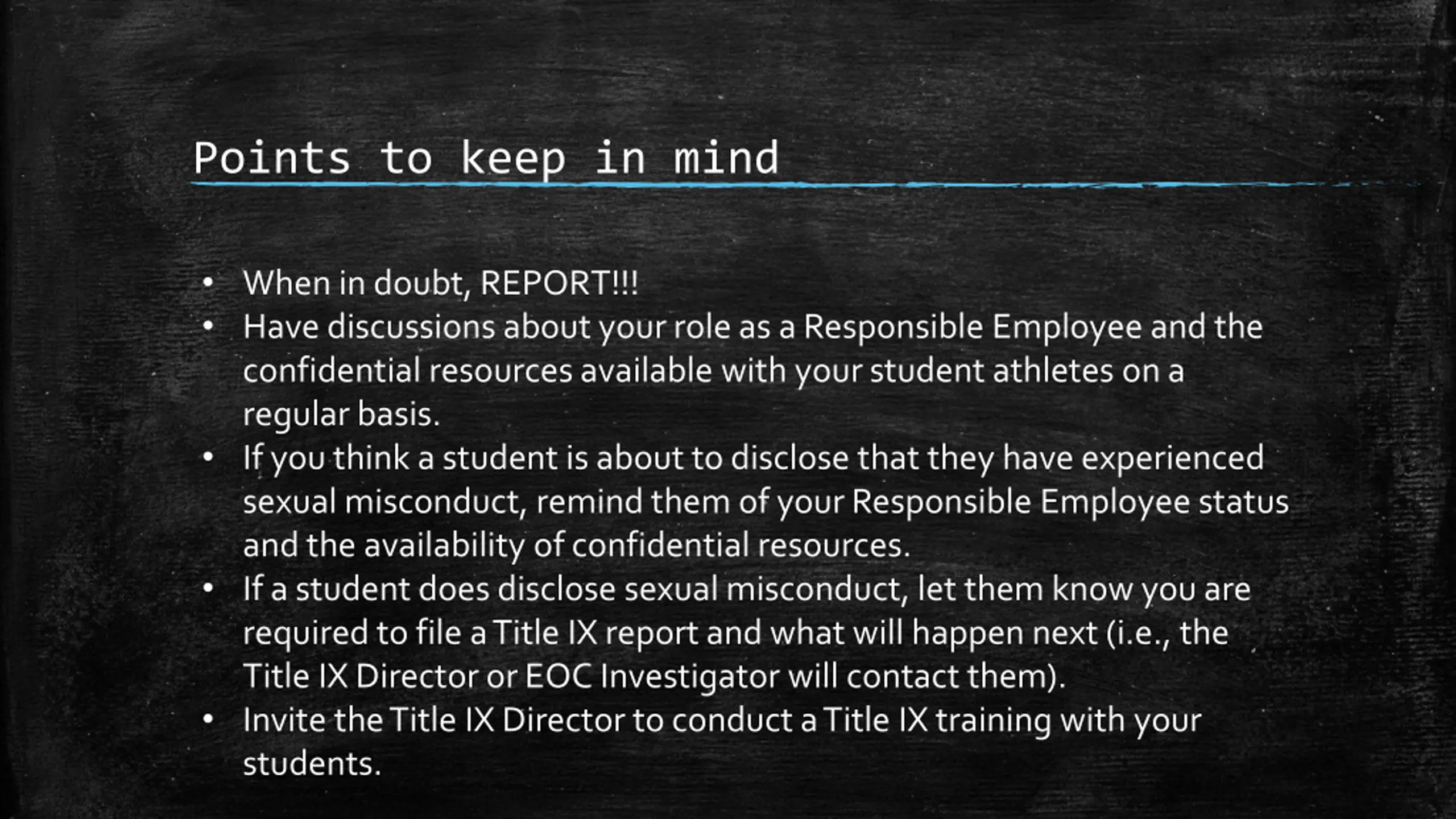 Points to keep in mind When in doubt, REPORT!!! Have discussions about your role as a Responsible Employee and the confidential resources available with your student athletes on a regular basis. If you think a student is about to disclose that they have experienced sexual misconduct, remind them of your Responsible Employee status and the availability of confidential resources. If a student does disclose sexual misconduct, let them know you are required to file a Title IX report and what will happen next (i.e., the Title IX Director or EOC Investigator will contact them). Invite the Title IX Director to conduct a Title IX training with your students.
