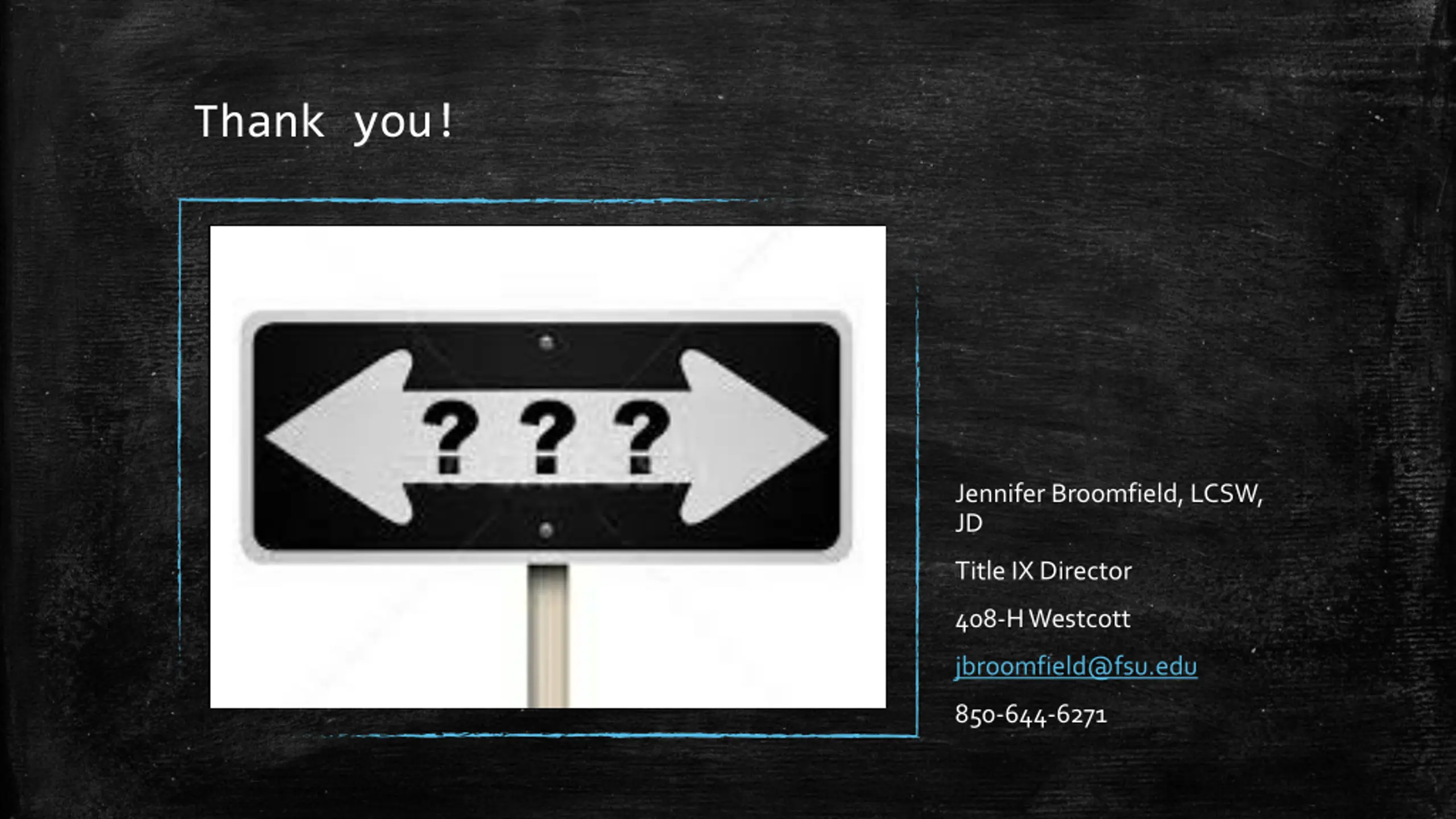 Thank you! Jennifer Broomfield, LCSW, JD Title IX Director 408-H Westcott jbroomfield@fsu.edu 850-644-6271
